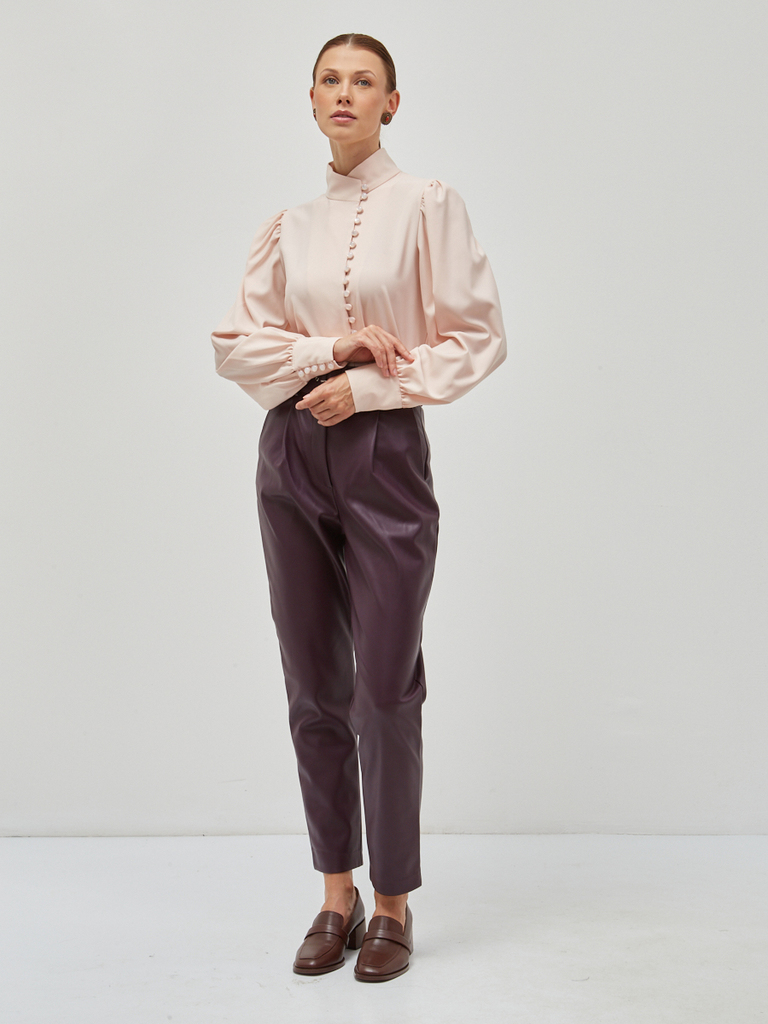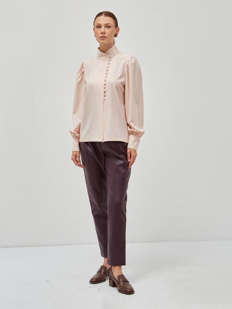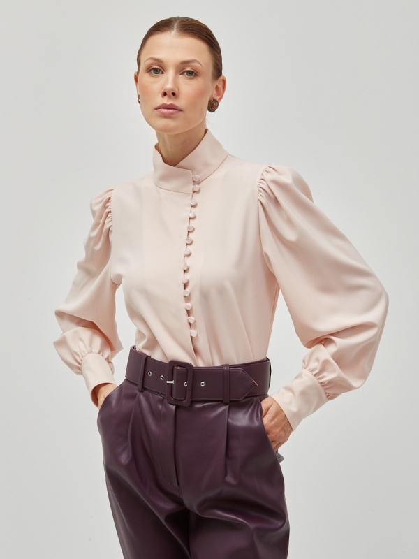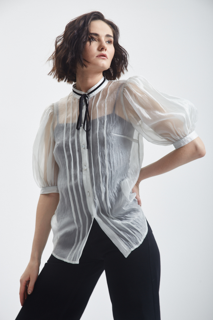 Блузка из органзы с воротником-стойкой и защипами