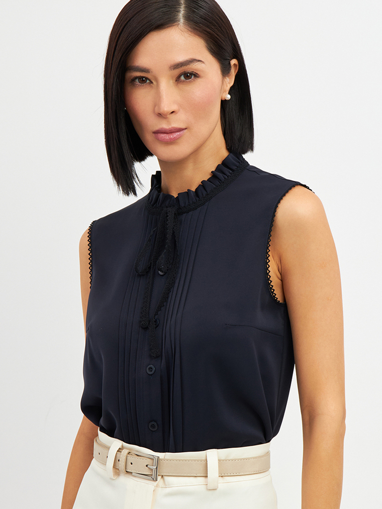 Блузка из органзы прямого силуэта с воротником-стойкой и завязками