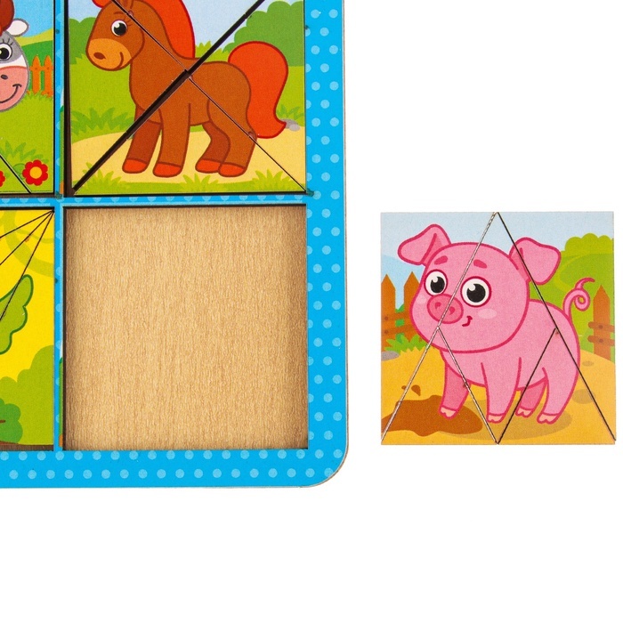 Головоломки - это отличный способ развития логики и мелкой моторики! Задача малыша - собрать квадраты из цветных элементов: треугольников, прямоугольников и других фигур в рамку. Сначала можно собират... Показать описаниеь изображения с животными,а затем однотонные картинки. В процессе ребёнок знакомится с новыми формами и цветами, учится соотносить части и целое. Постепенное усложнение заданий позволяет малышу самостоятельно осваивать материал и не прибегать к помощи родителей. Дополнительно Квадраты 2 в 1. С одной стороны у квадратов только цвет, а с другой стороны картинка.