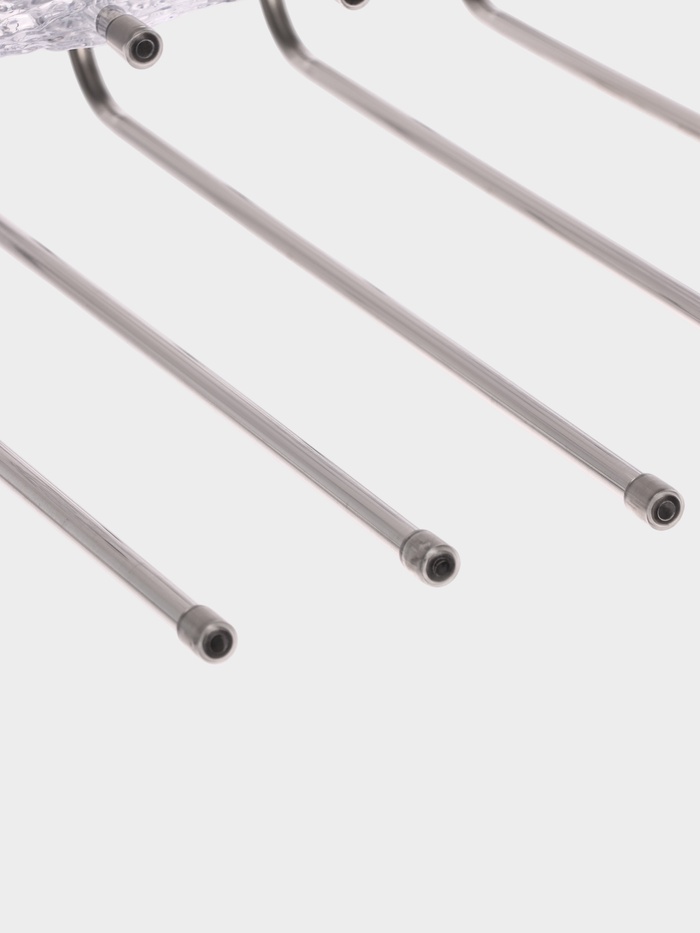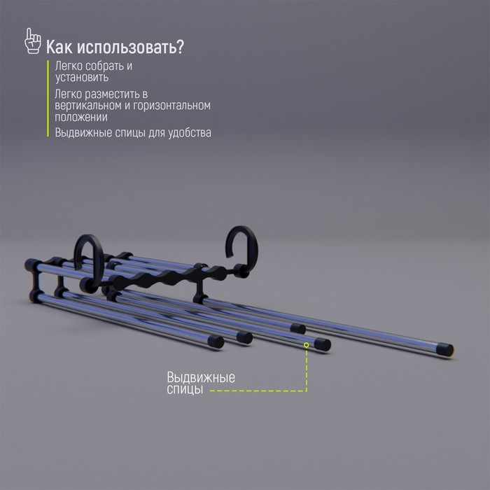 Вешалка — предмет, с которым мы сталкиваемся в каждом доме. Казалось бы, что может зависеть от такого привычного элемента? На самом деле очень многое! Например, будет ли одежда аккуратно висеть на пле... Показать описаниечиках или же беспорядочно валяться в шкафу. Раздвижная вешалка для брюк станет незаменимой в домашнем хозяйстве. Оцените преимущества изделия: * оно не требует специального ухода и прослужит ровно столько, сколько понадобится; * занимая совсем немного места, аксессуар помогает организовать зону гардероба и освобождает пространство; * удачно подобранная по стилю вешалка может стать настоящим украшением предмета мебели. Пользоваться изделием просто: 1. Подвесьте его горизонтально на штангу шкафа за оба крючка. 2. Снимите один из крючков. Спицы выдвигаются, что позволяет без труда снимать брюки. Дополнительно Универальны для любого размера одежды