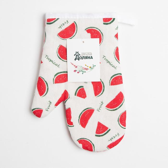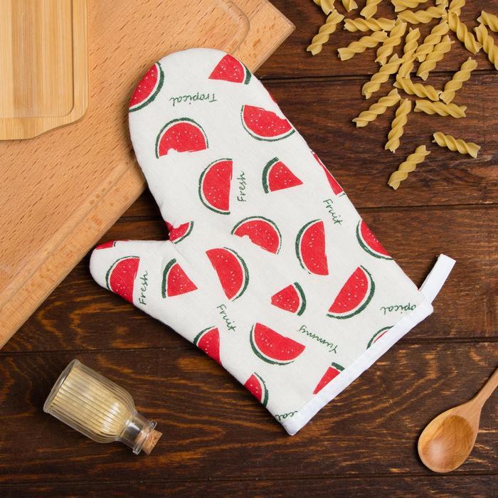 Эта яркая прихватка с арбузами защитит ваши руки от горячей посуды и станет украшением кухни. Плотный материал и удобная форма-варежка надежно удерживают сковороды и противни, а жизнерадостный рисунок... Показать описание создаёт летнее настроение даже в пасмурный день. Особенности * Удобный формат в виде варежки для надёжного захвата. * Плотная структура из полиэстера с ватином эффективно защищает от высокой температуры. * Яркая и стойкая печать с сочными арбузами не выцветает. * Универсальный белый фон гармонично сочетается с любой кухонной утварью. * Простой уход: стирка при 30°C сохраняет форму и цвет. * Подходит для использования в любой сезон — практичный аксессуар на каждый день. Практичная забота о ваших руках Каждый раз, когда вы достаёте что-то из духовки, эта прихватка становится вашим помощником. Её достаточный размер и теплоизоляция дают чувство уверенности. А рисунок с сочными дольками добавляет кухне уюта и тёплой, солнечной атмосферы, делая готовку приятнее.