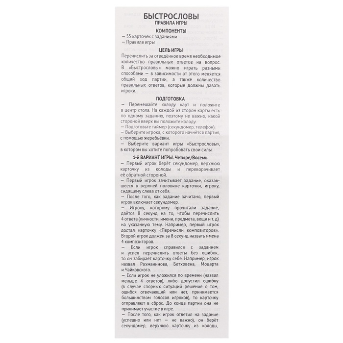 Это захватывающая и увлекательная игра, которая позволяет проверить свои навыки в быстром мышлении, логике и словарном запасе. Состоящая из 55 карточек, эта игра предлагает уникальный опыт и развивает... Показать описание не только интеллектуальные способности, но и коммуникативные навыки. Каждая карточка в игре "Быстрословы" содержит различные слова и фразы, которые игроки должны использовать для составления своих ответов. Цель игры заключается в том, чтобы как можно быстрее придумать слово или фразу, начинающуюся на последнюю букву слова, указанного на предыдущей карточке. Игроки должны быть быстрыми и творческими, чтобы придумывать новые слова и не повторяться."Быстрословы" подходит для игры как в кругу семьи или друзей, так и на вечеринках или в командной соревновательной форме. Эта игра способствует развитию речи, памяти, внимания и быстроты мышления. Кроме того, она помогает расширить словарный запас и улучшить коммуникативные навыки. В "Быстрословах" каждый игрок имеет возможность проявить свою креативность и остроумие, придумывая оригинальные и необычные слова. Благодаря разнообразию карточек, игра никогда не становится однообразной или предсказуемой. Каждый раунд предлагает новые вызовы и возможности для проявления своих способностей. Благодаря простым правилам и интересному геймплею, игра легко усваивается и подхоит всем возрастным группам. Выводя на новый уровень вашу способность быстро мыслить и находить оригинальные решения, карточная игра "Быстрословы" обещает множество часов увлекательного и интеллектуального развлечения. Увлекательная кооперативная игра, которая позволит вам применить логику и научиться работать в команде!