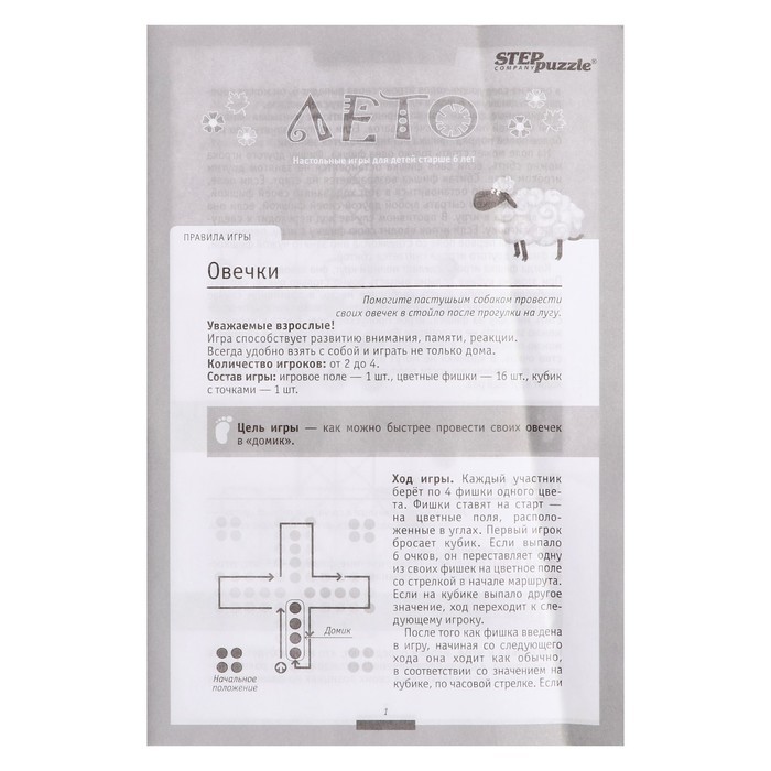 Станьте лучшим учеником в классе с настольной игрой «Теперь ты — школьник!» Посещайте разные уроки, правильно отвечайте на вопросы и получайте оценки — всё как в настоящей школе! Подготовка к игре 1. ... Показать описаниеРазделите карточки по виду вопросов на 5 колод. 2. Каждую колоду перемешайте и положите рубашкой вверх на отмеченные соответствующим цветом окошки на игровом поле. 3. Каждый участник берёт себе планшет-дневник. Маркер положите рядом с игровым полем, чтобы каждому игроку было удобно его брать. 4. Каждый игрок выбирает себе фигурку и ставит на клетку, отмеченную звоночком. Как играть Задача каждого игрока — первым заработать 10 галочек в дневнике, правильно отвечая на вопросы. 1. Определите очерёдность игроков. 2. В свой ход игрок бросает кубик и переставляет фигурку на количество клеток, равное числу, выпавшему на кубике. 3. Игрок может зайти в кабинет, если количество клеток до него меньше или равно выпавшему на кубике числу. 4. Игрок может двигаться в любом направлении и к любому классу, в котором он хотел бы отвечать на вопросы. 5. Как только участник добирается до класса, его соперник берёт оттуда карточку с вопросом и зачитывает его вслух. Соперник будет видеть на карточке верный ответ и сможет проверить игрока. 6. Если игрок отвечает правильно, он ставит себе галочку в дневнике напротив предмета, по которому он отвечал. Если игрок ответил неправильно, галочку он не ставит. 7. Карточка с вопросом, на который отвечал игрок, уходит в сброс. 8. Ход передаётся следующему игроку. 9. В один и тот же класс нельзя заходить два раза подряд. 10. Победителем становится игрок, который первым наберёт 10 галочек у себя в дневнике. Чем полезна настольная игра С настольной игрой «Теперь ты — школьник!» ребёнок прокачает логическое мышление и кругозор! Ведь вопросы на карточках не такие уж простые и проверяют знания из самых разных областей, а чтобы победить, нужно отвечать на вопросы лучше соперников! Настольная игра «Теперь ты — школьник!» рекомендована для детей от 5 лет. Рассчитана на 2–4 игроков. Комплектация * 4 фишки 1,2 ? 2,5 см. * Кубик 1,4 ? 1,4 см. * Игровое поле 40 ? 40 см. * 4 односторонних дневника 14,7 ? 21 см. * 250 двусторонних карточек 8,5 ? 5,5 см. * Правила.