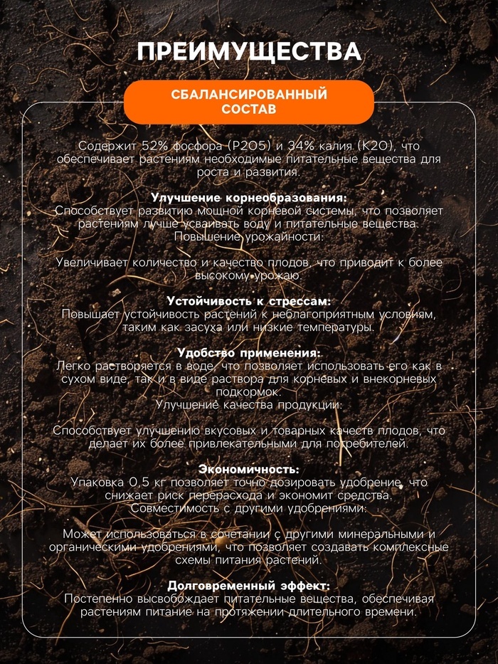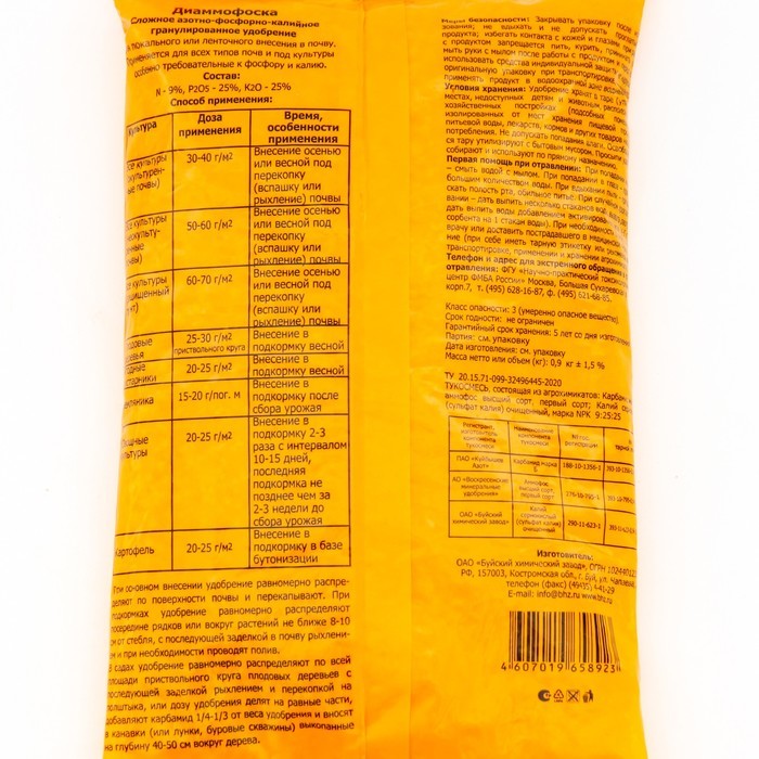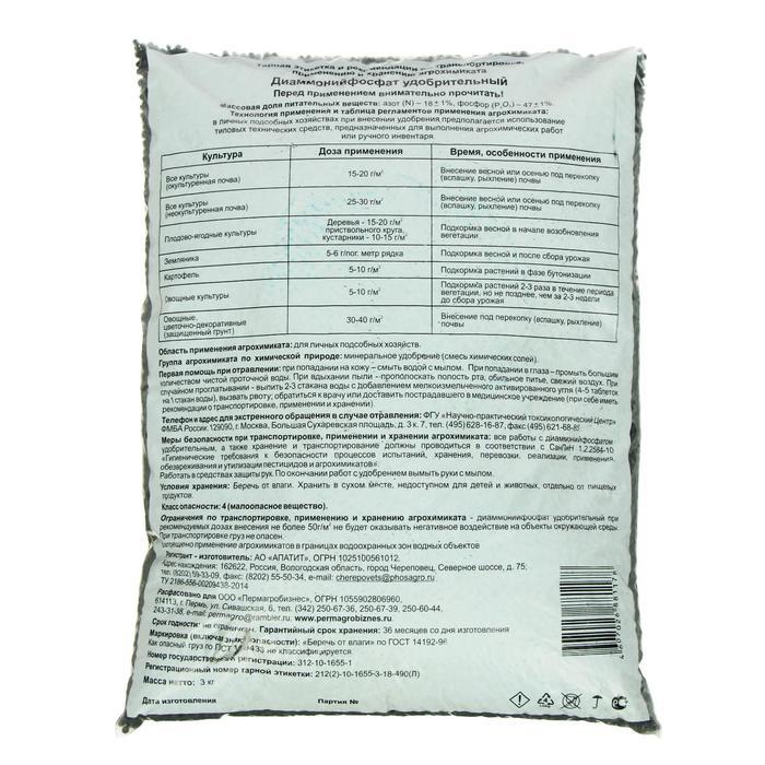 Удобрение минеральное Диаммонийфосфат (Суперфосфат двойной), 3 кгУдобрение "Диаммонийфосфат" (также известное как суперфосфат двойной) представляет собой высокоэффективное средство для улучшения качес... Показать описаниетва почвы и повышения урожайности. Это минеральное удобрение широко используется для основного и местного внесения, а также для подкормок в период вегетации растений. Применение данного удобрения способствует повышению урожайности и улучшению качества плодов и овощей.Преимущества удобрения "Диаммонийфосфат":1. Ускорение роста растений. Благодаря высокому содержанию азота (18%) данное удобрение способствует активному росту растений, что позволяет получить более обильный урожай.2. Повышение качества плодов. Высокая массовая доля фосфора (47%) способствует формированию качественных плодов и овощей, а также повышению их товарных качеств.3. Увеличение срока хранения овощей. Применение удобрения "Диаммонийфосфат" способствует улучшению структуры почвы, что в свою очередь положительно сказывается на сроке хранения овощей.Удобрение "Диаммонийфосфат" является эффективным средством для улучшения плодородия почвы и повышения урожайности как на сельскохозяйственных угодьях, так и в частных приусадебных участках. Благодаря своему составу и свойствам, данное удобрение является незаменимым помощником для садоводов, огородников и фермеров.Массовая доля питательных веществ в удобрении "Диаммонийфосфат":- Азот (N) - 18%- Фосфор (P2O5) - 47%Начните применять удобрение "Диаммонийфосфат" уже сегодня, и вы увидите значительное улучшение качества почвы, активный рост растений и обильный урожай. Уверены, что использование данного удобрения принесет вам отличные результаты и поможет достичь высоких показателей урожайности.Не откладывайте заботу о почве и растениях на потом - применяйте удобрение "Диаммонийфосфат" и наслаждайтесь здоровыми и обильными урожаями!