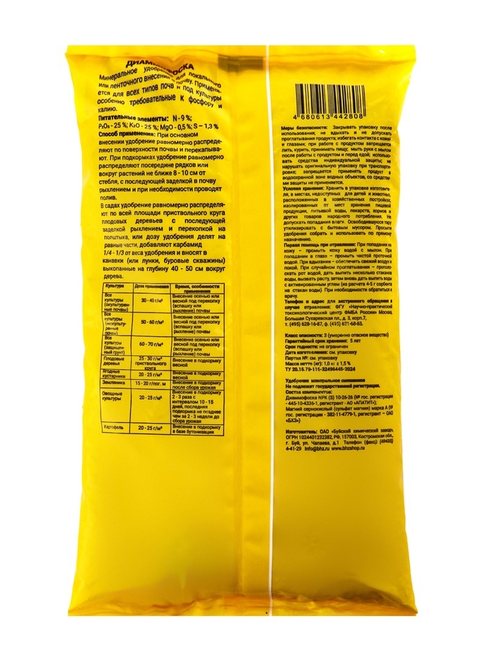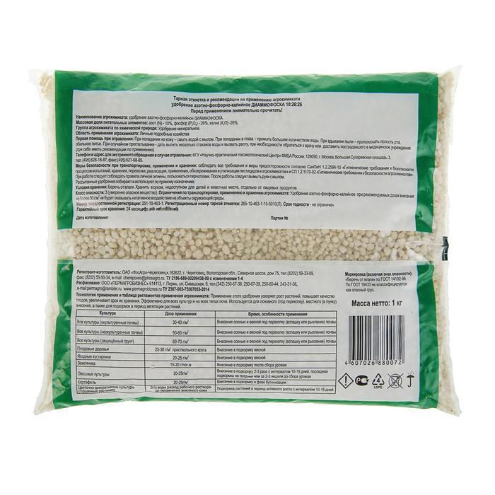 Удобрение "Пермагробизнес" представляет собой минеральное удобрение, известное под названием "Диаммофоска". Это азотно-фосфорно-калийное удобрение, которое обладает оптимальным соотношением питательны... Показать описаниех веществ и подходит для использования на любых типах почв.Состав удобрения "Диаммофоска" включает в себя следующие массовые доли питательных веществ: азот – 10%, фосфор – 26%, калий – 26%. Такое сочетание питательных элементов обеспечивает растения необходимыми элементами для полноценного роста и развития.Преимущества использования удобрения "Диаммофоска" очевидны. Азот способствует активному росту зеленой массы растений, фосфор обеспечивает формирование корневой системы и цветение, а калий улучшает устойчивость к стрессам и повышает урожайность.Эффективность удобрения "Диаммофоска" подтверждена многолетним опытом его использования. Начните применять удобрение "Диаммофоска" уже сегодня, и вы увидите значительное улучшение качества и урожайности ваших культур. Уверены, что с помощью нашего удобрения вырастите богатый и качественный урожай, который порадует вас и ваших клиентов.Мы гарантируем высокое качество удобрения "Диаммофоска" и его полное соответствие всем необходимым стандартам и требованиям. Наша продукция прошла все необходимые сертификационные испытания и имеет положительные отзывы от профессиональных агрономов и фермеров.Убедитесь сами в эффективности удобрения "Диаммофоска" и начните использовать его уже сегодня. Позвольте вашим растениям получить все необходимые питательные вещества для здорового роста, развития и обильного плодоношения.