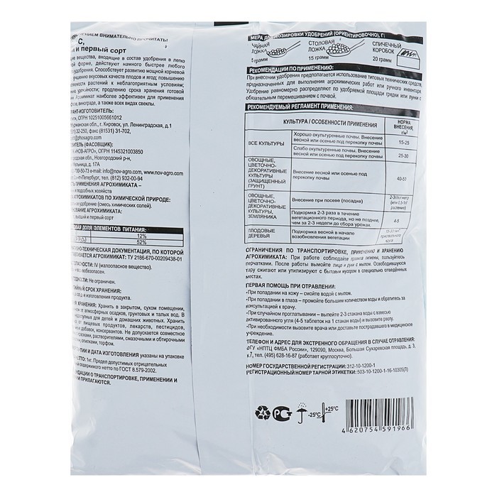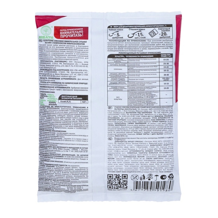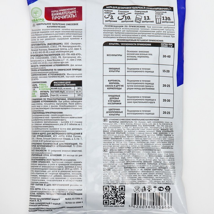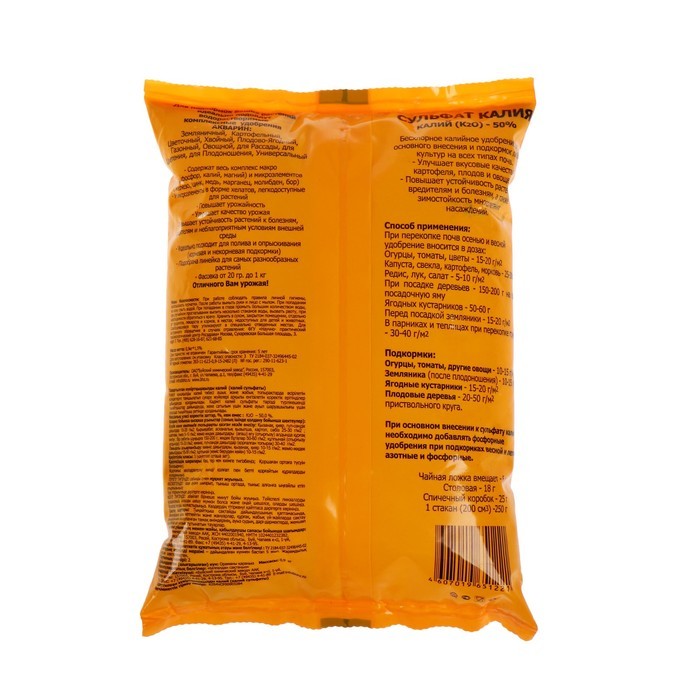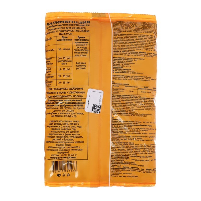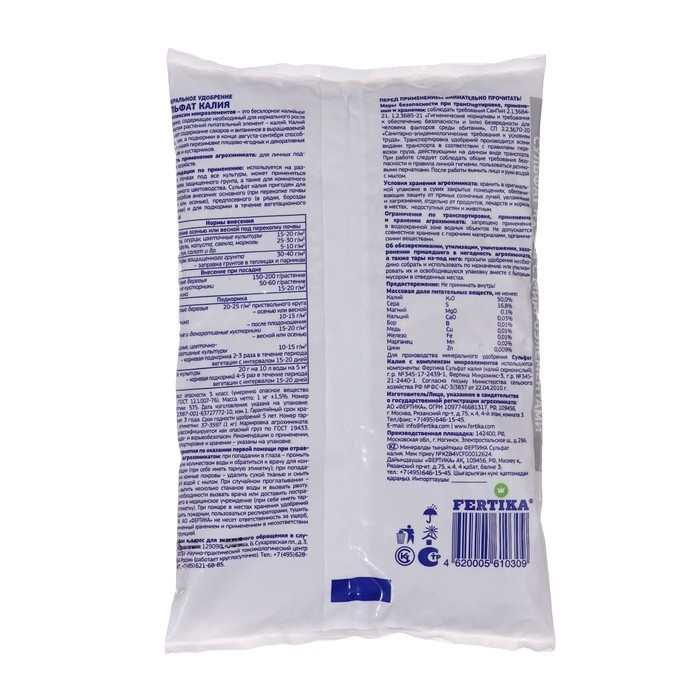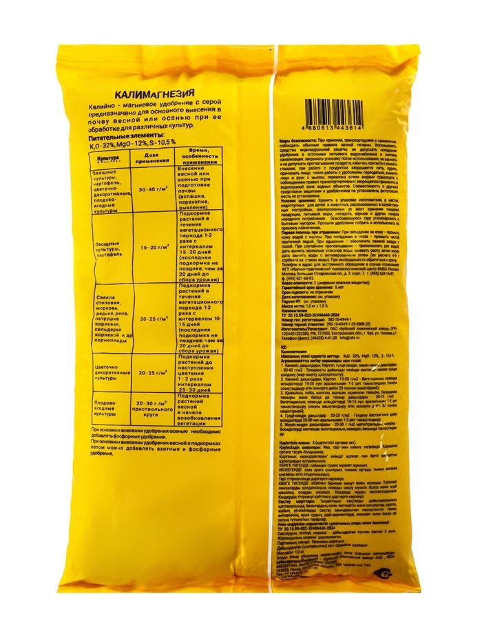 ~ Увеличивает урожайность всех культур. ~ Повышает сопротивляемость растений к заболеваниям. ~ Улучшает вкус и качество урожая. ~ Увеличивает длительность хранения урожая. Состав: Калий > 25,4% Маг... Показать описаниений > 0,87% Срок годности: 5 лет Условия хранения (температура): от -30 до +30 Рекомендации по применению: При внесении удобрения рекомендуется использование типовых технических средств, предназначенных для выполнения агрохимических работ или ручного инвентаря. При основном внесении удобрение ранвомерно рассыпают по поверхности почвы и проводят вспашку или перекопку или рыхление. При посеве и посадке овощных культур удобрение вносят в рядки или лунки и перемешивают с почвой. При подкормках удобрение равномерно распределяют между рядами растений (в междурьядьях) или вокруг растений не ближе 8-10 см от стебля, или по поверхности почвы, с последующей заделкой удобрения в почву рыхлением. После подкормки растения рекомендуется обильно полить.