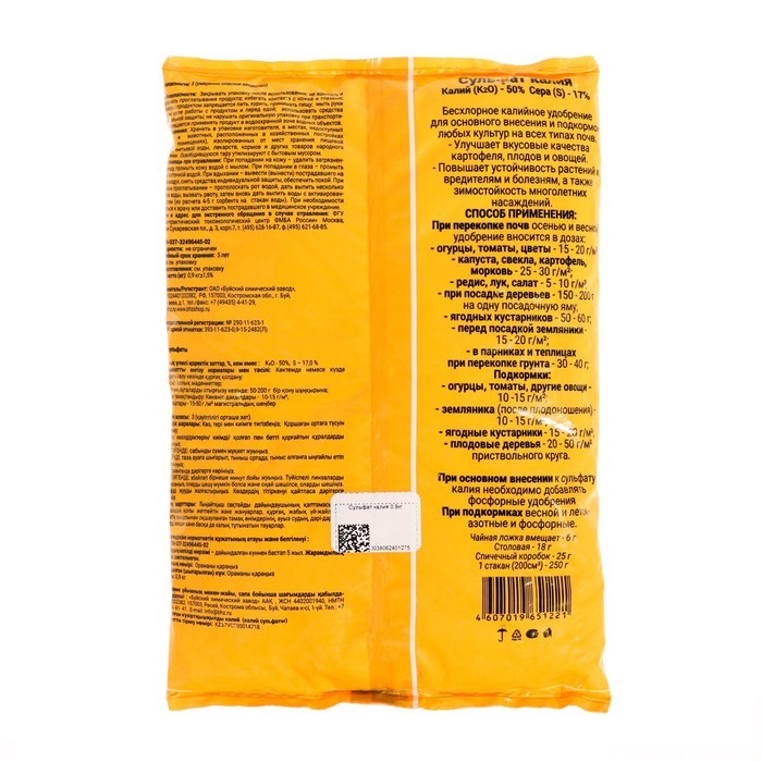 «Сульфат калия» — это традиционное минеральное удобрение универсального назначения для основного внесения и подкормок любых культур. Содержание калия в составе — 53 %. Растворимость — 100 %. Средство ... Показать описаниепредставляет собой белый кристаллический порошок. Период применения: с апреля по сентябрь.