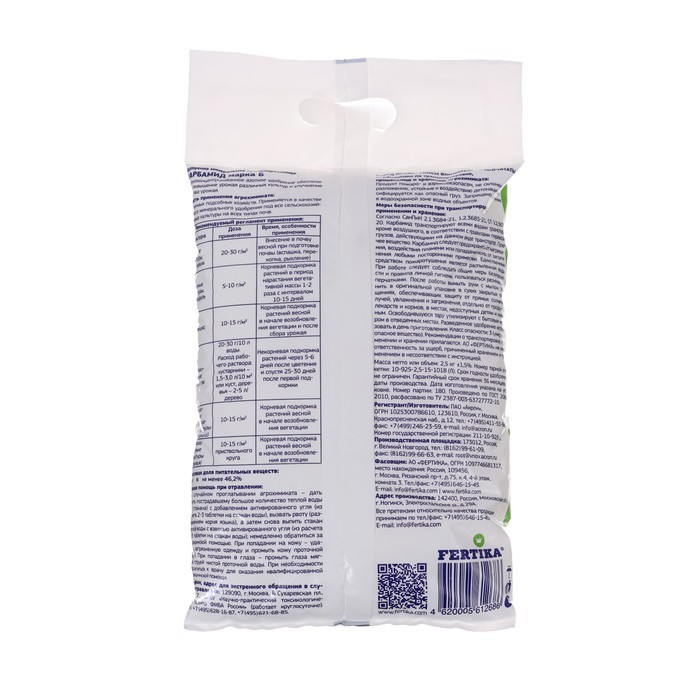FERTIKA Карбамид - концентрированное азотное удобрение для повышения урожайности различных сельскохозяйственных культур.ПреимуществаУниверсальный состав подходит для всех растений: овощей, ягод, плодо... Показать описаниевых деревьев.Средство быстро растворяется в воде и всасывается корнями.Удобрение безопасно, не содержит хлора.Область примененияУдобрение FERTIKA карбамид (мочевина) растворяют в воде и используют для подкормки плодовых деревьев, ягодных кустарников, овощных культур, земляники. Рекомендуется вносить удобрение весной при перекопке почвы и летом в начале вегетационного периода.