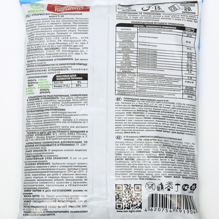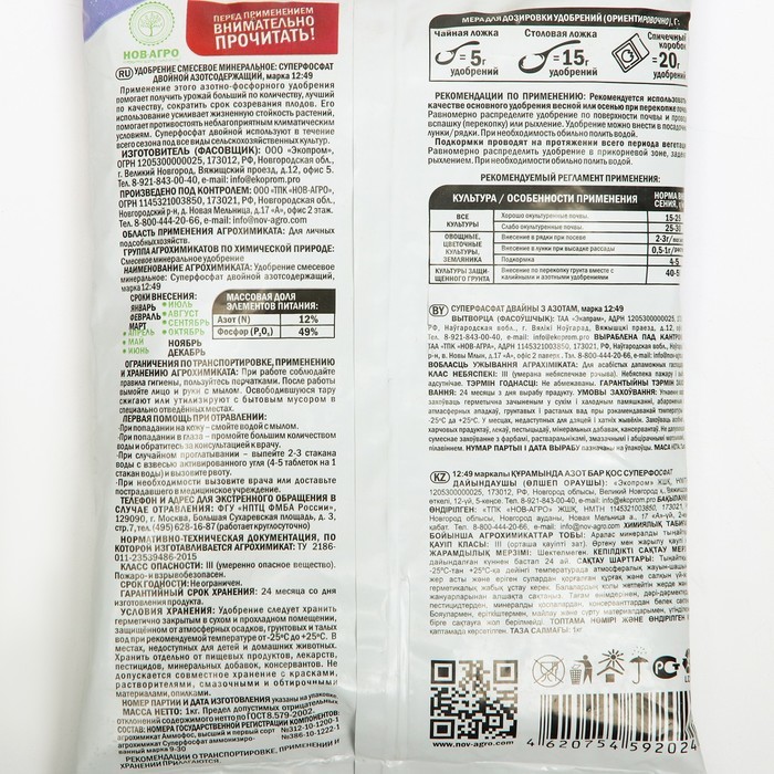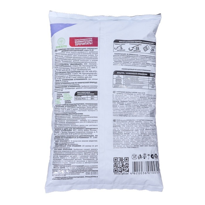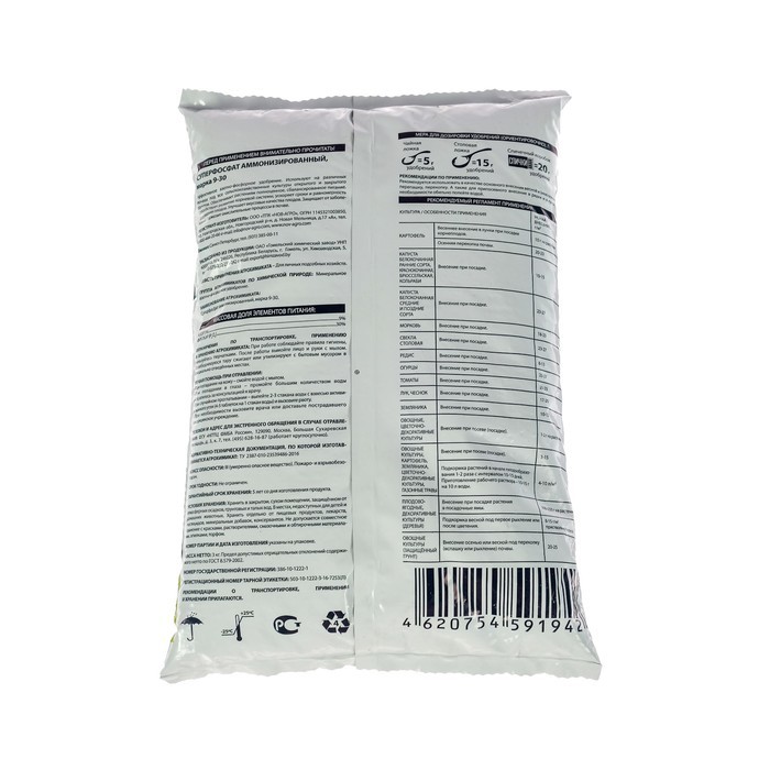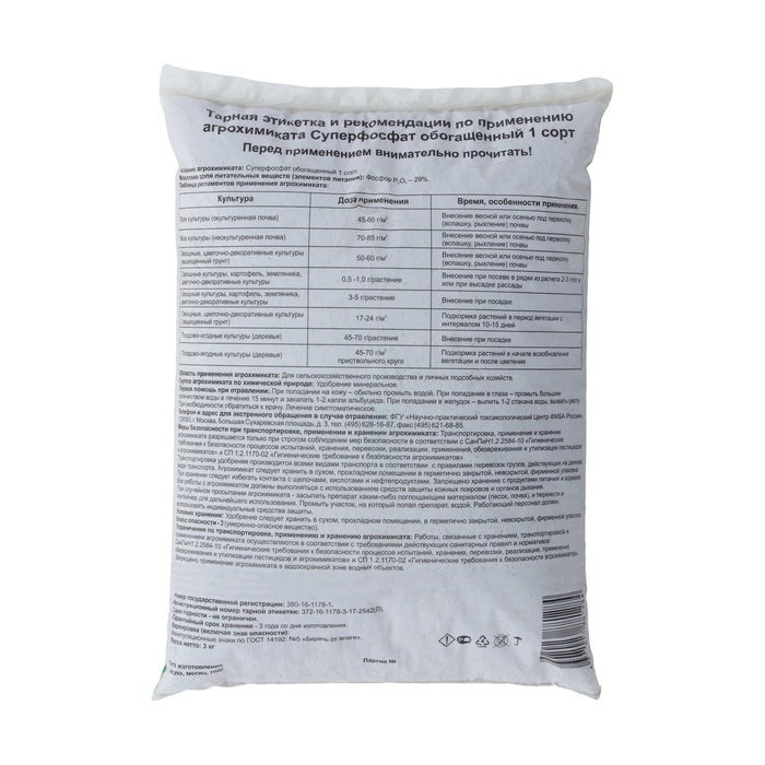 Суперфосфат двойной азотсодержащий — высококонцентрированное фосфорное удобрение. Используется для основного и предпосевного внесения, а также для подкормок овощных, плодово-ягодных, цветочных и др. к... Показать описаниеультур, выращиваемых на всех типах почв. Обеспечивает развитие корневой системы, ускоряет рост и цветение растений, созревание плодов. Способ применения: Основное внесение при перекопке почвы осенью или весной в открытом грунте 15-20 г/м2 на окультуренных почвах, 25-30 г/м2 - на неокультуренных почвах: В парниках и теплицах - 20-25 г/м2, при посадке плодово - ягодных и декоративных деревьев и кустарников - 80-200 г на посадочную яму. Местное внесение - при посеве 2-3 на метр рядка или 0,5-1,0 г в лунку при посадке картофеля и рассады с последующим перемешиванием с землёй. Овощные и цветочные 2-3 раза в период вегетации из расчета 20-30 г на 10 м2 в сухом виде водного раствора, растворив в 10 л. Подкормки: Овощные и цветочные 2-3 раза в период вегетации из расчета 20-30 г на 10 м2 в сухом виде водного раствора, растворив в 10 л. Многолетние плодовые деревья ранней весной и после цветения при рыхлении (перекопке) приствольных кругов - 100-150 г на 10 м2.