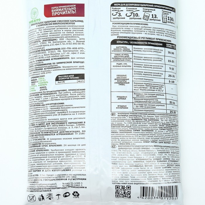 Благодаря искусству учёных-селекционеров получить хороший урожай можно даже в неблагоприятных условиях. Сделать это позволяет правильный уход и своевременные подкормки качественным и правильно подобра... Показать описаниенным удобрением. Удобрение минеральное Карбамид (мочевина), 3 кг хорошо повлияет на развитие ваших растений. Благодаря такой помощи любой кустарник, корнеплод или цветок будет сильным, здоровым, а урожай — великолепным. Карбамид (мочевина) - универсальное концентрированное удобрение, хорошо растворимое в воде, с содержанием азота 46,2%. Используется для внесения под все выращиваемые культуры на всех типах почв: как основное удобрение совместно с фосфорными и калийными при подготовке почвы перед посевом (посадкой) весной; для корневых и внекорневых подкормок в период вегетации. Советы садоводу: * Опрыскивание растений следует производить рано утром или после захода солнца. * Жидкий навоз нельзя применять неразбавленным. Его разводят с водой в пропорции 1:10. * Избыток азотных удобрений снижает жизнеспособность растений и их стойкость к болезням. * Удобрения влияют и на сорняки. Подбирать прикормку следует, исходя из того, какое растение вы обрабатываете.