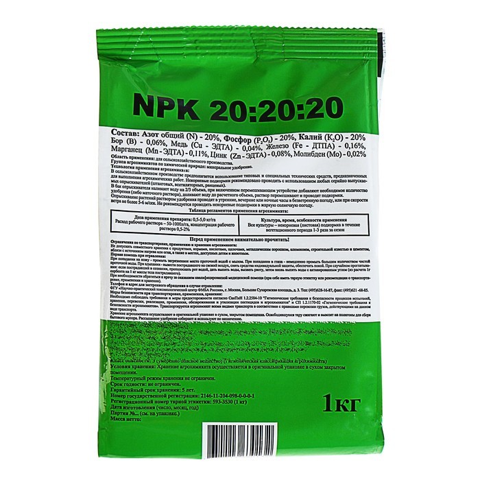 Плантафид 20.20.20 – современное высокоэффективное водорастворимое комплексное удобрение для листовой подкормки. Его применяют для листовой подкормки различных культур. Некорневые подкормки обеспечива... Показать описаниеют быстрое пополнение растения макро- и микроэлементами. Это универсальная формула с равным содержанием азота N, фосфора P и калия K, а также комплексом микроэлементов, усиливающие действие препарата. Удобрение разработано только для листовых подкормок. Минеральное удобрение Плантафид 20.20.20 применяют в основной период роста растения (самый продолжительный по времени). Применяется, когда необходимо внести равные дозы питательных веществ или сбалансировать питание в процессе формирования генеративных органов. Удобрение повышает усвоение питательных веществ из удобрений, внесенных под корень. От стадии пересадки рассады до стадии наливания плода. Незаменимым агротехническим приемом является проведение некорневых подкормок в периоды с неблагоприятными климатическими условиями, когда затрудняется поглощение элементов питания корневой системой (заморозки, переувлажнение, засуха, экстремально высокие температуры воздуха и грунта, защелачивание почвы и пр.) Плантафид рекомендуется вносить: * при сниженной активности корневой системы; * при неэффективной работе корневой системы вследствие плохой аэрации, низких температур почвы, наличия патогенов; * при ограниченном поступлении питательных веществ в почву; * при слабом развитии корневой системы, когда она не способна обеспечить растение необходимыми питательными веществами в критических стадиях роста. Преимущества: * высокое содержание питательных веществ (в состав входят ПАВ и адъюванты, повышающие кутикулярную проницаемость и эффективность листовых подкормок); * наличие прилипателя в составе удобрения; * хелатная форма веществ (т.е. легкодоступной для растения форме); * в составе нет Na и Cl; * можно миксовать с другими средствами (может смешиваться и применяться с большинством пестицидов); * прекрасная растворимость; * не оставляет солевого налета на листьях после подкормки за счет высокой степени очистки.