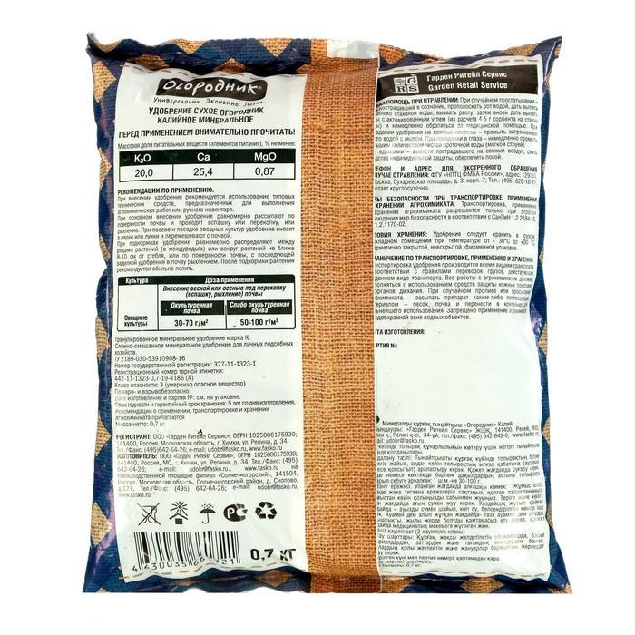 Удобрение сухое "Калийное" минеральное гранулированное, Огородник, 0,7 кгВопросы по товару