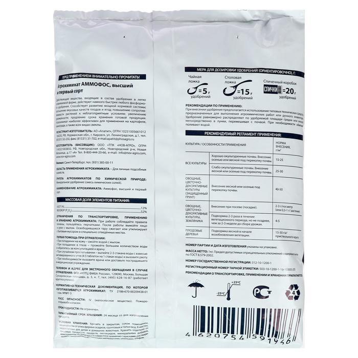 Удобрение "Аммофос" - это высококачественное минеральное удобрение, предназначенное для повышения плодородия почвы и обеспечения растений необходимыми питательными веществами. Сочетание азота и фосфор... Показать описаниеа в оптимальных пропорциях делает "Аммофос" эффективным средством для улучшения роста и развития всех видов культур.Основные характеристики удобрения "Аммофос":- Массовая доля азота - 12%, что обеспечивает растения необходимым количеством азота для активного роста и развития.- Массовая доля фосфора - 52%, что способствует формированию крепкой корневой системы и улучшению процессов цветения и плодоношения.Преимущества использования удобрения "Аммофос":1. Универсальность. Удобрение подходит для основного и локального внесения, а также для подкормок всех выращиваемых культур, включая овощи, фрукты, зерновые, ягоды и декоративные растения.2. Эффективность. Благодаря оптимальной концентрации питательных веществ, "Аммофос" обеспечивает быстрый и устойчивый рост растений, улучшение качества урожая и повышение его урожайности.3. Простота применения. Удобрение легко дозируется и смешивается с почвой, что делает процесс внесения удобрения "Аммофос" удобным и доступным даже для непрофессиональных садоводов и фермеров.Рекомендации по применению:- Для основного внесения удобрения "Аммофос" необходимо равномерно распределить его по всей площади почвы перед посевом или посадкой растений.- Для локального внесения удобрения "Аммофос" следует распределять вблизи корневой зоны растений, обеспечивая им доступ к необходимым питательным веществам.- Для подкормок культур удобрение "Аммофос" рекомендуется вносить в периоды активного роста и развития растений, следуя инструкциям по дозировке.Начните применять удобрение "Аммофос" уже сегодня и вырастите богатый урожай! Обеспечьте вашим растениям оптимальные условия для роста и развития с помощью нашего надежного удобрения.