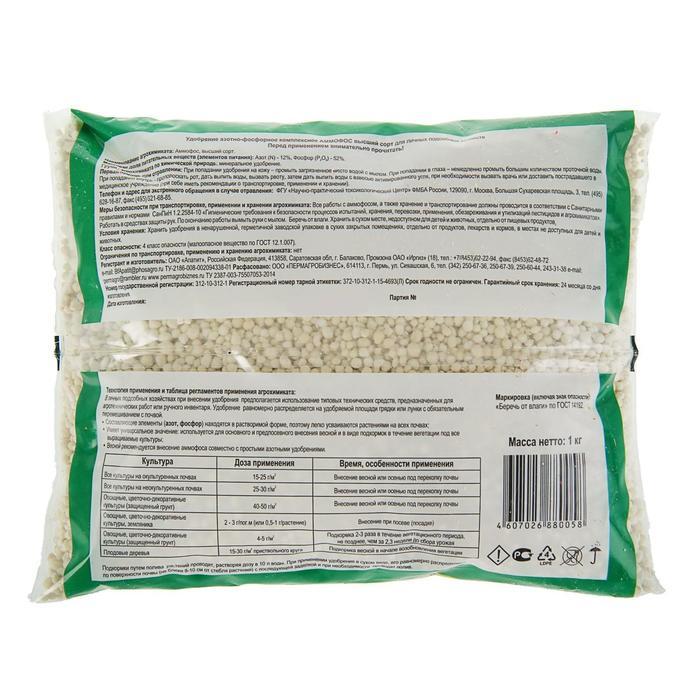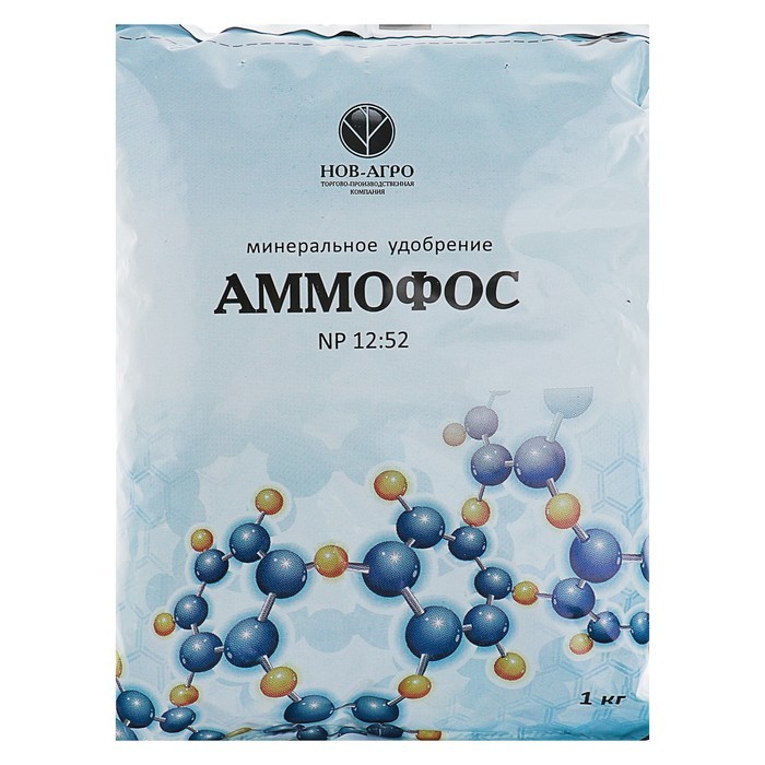 Аммофос – моноаммонийфосфат (NH4H2PO4) – это сложное удобрение, получаемое в результате реакции нейтрализации фосфорных кислот аммиаком. В его состав входят 42-52 % фосфора и 10-12% аммонийного азота.... Показать описание Фосфор содержится в водорастворимой форме. Таким образом, аммофос – это водорастворимое безнитратное удобрение с достаточно большой концентрацией действующих элементов, удобрение для растений, которое подойдет для любых грунтов и растительных культур, вне зависимости от того, открытый это будет грунт, или защищенный (теплицы). На основе этого комплексного удобрения готовят различные марки смешанных удобрений (тукосмеси). Аммофос не содержит тяжелых металлов. Производится аммофос из апатитового сырья, которое насыщает грунт полезными веществами, металлами и микроэлементами, играющими важнейшие роли в процессе обмена веществ растений: магний, кремний, цинк, железо и др. Это удобрение увеличивает урожаи, обеспечивает наилучшее развитие сельскохозяйственных культур, способствует устойчивости растений перед неблагоприятным климатом и рядом заболеваний. Урожай, полученный с использованием аммофоса, содержит меньше нитратов и хранится дольше обычного.