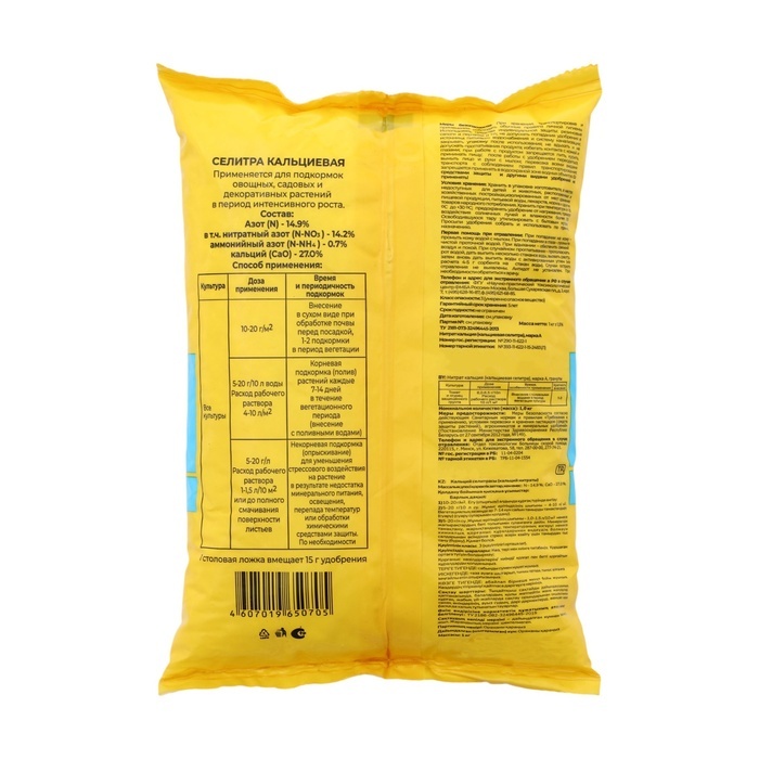 Аммиачная Селитра - универсальное азотное удобрение для овощных, плодово-ягодных и цветочных культур, содержит в составе комплекс микроэлементов в сбалансированном соотношении, что позволяет обеспечит... Показать описаниеь интенсивный рост и формирование хорошо развитой вегетативной массы, а также характерную окраску растений.Хорошо растворяется в воде, может быть использовано в качестве основного удобрения и в виде подкормок любых плодовых, ягодных и овощных культур.При проявлении признаков азотного голодания проводят внекорневую подкормку.Необходимость в проведении внекорневой подкормки может возникнуть также сразу после образования завязей плодов и ягод и их последующем осыпании.Состав: Азот N 34,4, Кальций, Магний, Бор, Цинк, Сера, медь, Железо, Марганец.Норма расхода: 15-20 г/кв.м. - подкормка в начальные фазы развития культуры.Внесение перед посадкой с заделкой в почву на глубину 15-20 см и в подкормку в начальные фазы развития культуры (овощные, ягодные культуры): 15-30 г/кв.м.
