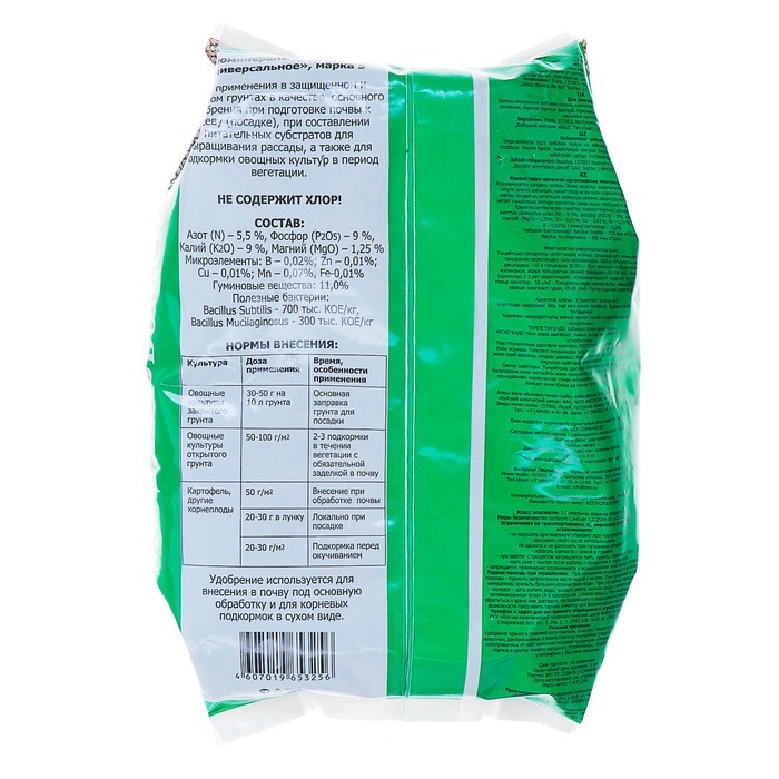 Высококонцентрированное органическое удобрение. Подходит для всех видов растений сада и огорода: плодовых деревьев и кустарников, овощей и декоративных растений, цветов, рассады. Предназначено для ест... Показать описаниеественного восстановления и повышения плодородия почвы, обеспечения сбалансированного питания и формирования мощной корневой системы растений, приживаемости рассады, а также ускорения сроков созревания урожая. Удобрение обладает рядом преимуществ перед аналогичными органическими удобрениями.
