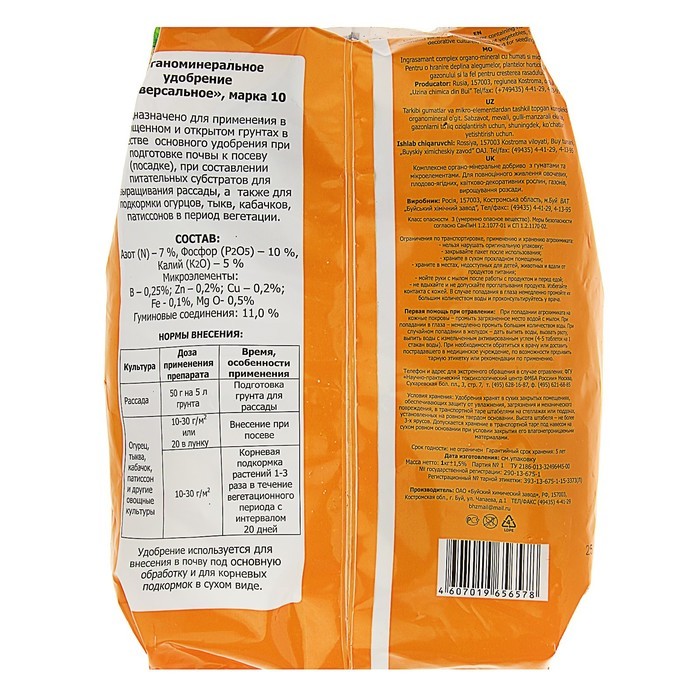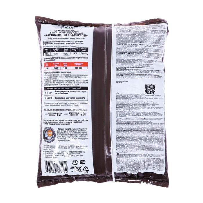Назначение: комплексное минеральное удобрение для полноценного питания картофеля. Состав и соотношение элементов питания подобраны с учетом требований картофеля к минеральному питанию. Состав: N (%): ... Показать описание10 P2O5 (%): 6 K2O (%): 16 MgO (%): 6 Микроэлементы: В,Мо (присутствие) Внешний вид: гранулы бело-розово-коричневого цвета Рекомендации по применению: Выбрать культуру Картофель Доза применения препарата: 50-60 г/м2 - вразброс перед перекопкой 10 г/лунку - при посадке 20 г/1 м рядка - при подкормке (перед окучиванием) Время, особенности применения: 1 стакан (250 мл) вмещает 200 г удобрения, 1 спичечный коробок – 20 г удобрения.