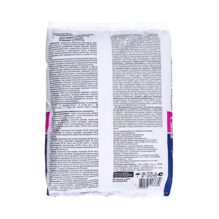 Удобрение "ГЕРА" для Картофеля, моркови и свеклы, с диатомитом, 0,9 кгВопросы по товару