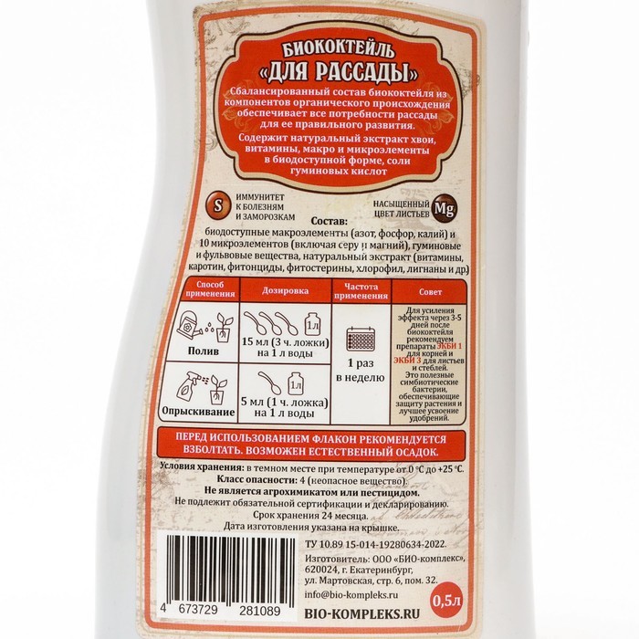 Чудо-коктейль не только питает будущий помидорчик или перчик, но и усиливает иммунитет маленького растения, делая его крепким и здоровым. Мы заботимся о том, чтобы вы и ваши дети питались только здоро... Показать описаниевыми овощами со своей грядки! 5 в 1: биококтейль «Для рассады» выполняет функции органического удобрения, стимулятора роста, иммуномодулятора, средства защиты от вредителей и от болезней. Полезные свойства: защищает от вредителей и болезней (в т.ч. от черной ножки); стимулирует формирование хорошо развитой корневой системы; сера (S) повышает иммунитет и усиливает устойчивость к перепадам температур; Магний (Mg) способствует развитию крепких растений без перерастания; все компоненты в биодоступной форме легко усваиваются растениями. Видимый результат: крепкие стебли, здоровые изумрудные листья, хорошо развитая корневая система. Здоровая рассада без химии! Состав: биодоступные макроэлементы (азот, фосфор, калий) и 10 микроэлементов (включая серу и магний), гуминовые и фульвовые вещества, натуральный экстракт (витамины, каротин, фитонциды, фитостерины, хлорофилл, лигнаны и др.) Способы применения: полив опрыскивание