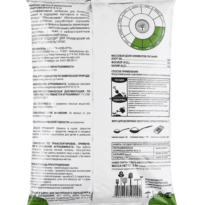 Смесевое минеральное,высокоэффективное для основного внесения и подкормки картофеля в период вегетации .Обеспечивает питание растений , способствует хорошему плодоношению и приросту биомассы корнеплод... Показать описаниеов. Повышает устойчивость растений к заболеваниям и вредителям , а также к неблагоприятным воздействиям окружающей среды. Массовая доля питательных веществ : азот -10%,фосфор - 12%,калий -14%.