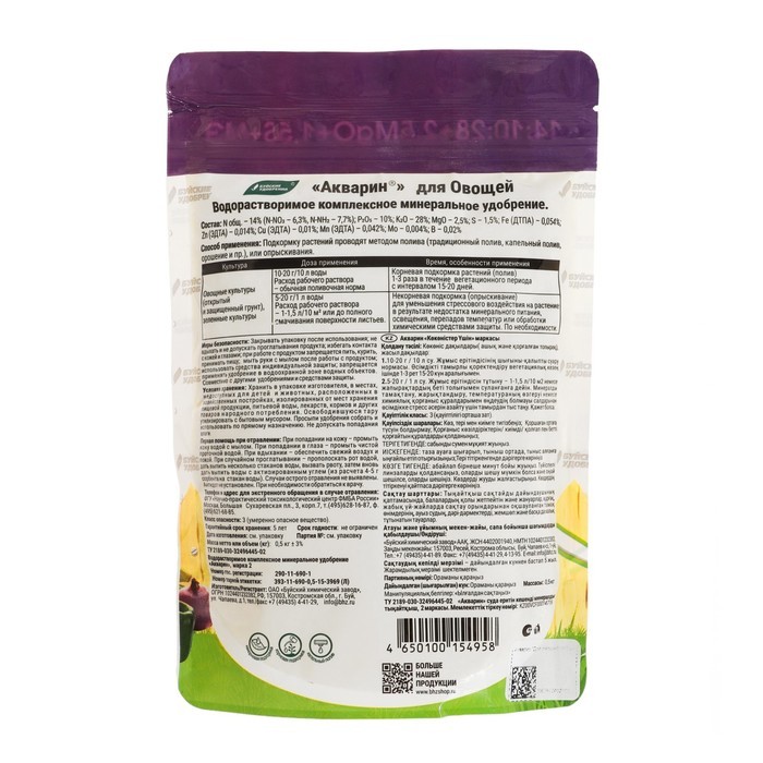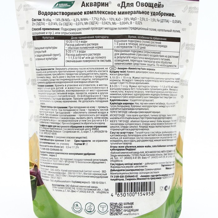 Удобрение комплексное водорастворимое Акварин "Для овощей", 0,5 кгВопросы по товару