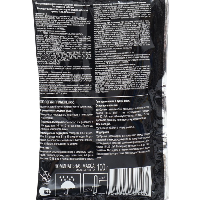 Удобрение водорастворимое c аминокислотами для огурцов, кабачков. Подходит также для патиссонов и тыкв. Полностью водорастворимое удобрение. 2 в 1 можно использовать в сухом или в жидком виде. Экономи... Показать описаниечно: 1 пакетик на 200 л воды. Стимулирует обильное плодоношение. При применении в жидком виде Рекомендуется чередовать корневые и внекорневые подкормки. Для корневой подкормки отмерить 1 г и развести в 1 литре воды или 10 г в 10 литрах воды. Полив до увлажнения земляного кома. Для внекорневой подкормки отмерить 0,5 г и развести в 1 л воды или 5 г в 10 литрах воды. Опрыскивание до полного смачивания листвой поверхности. Избегать попадания на цветки. Как использовать: для овощных культур защищенного и открытого грунта (огурцов, кабачков, цуккини, тыкв, патиссонов) 4-6 раз с интервалом 10-15 дней в течение вегетационного сезон. Состав: Сбалансированный состав и доступная форма элементов питания серии: азот+фосфор+калий+магний+ 6 микроэлементов в хелатной форме, аминокислоты