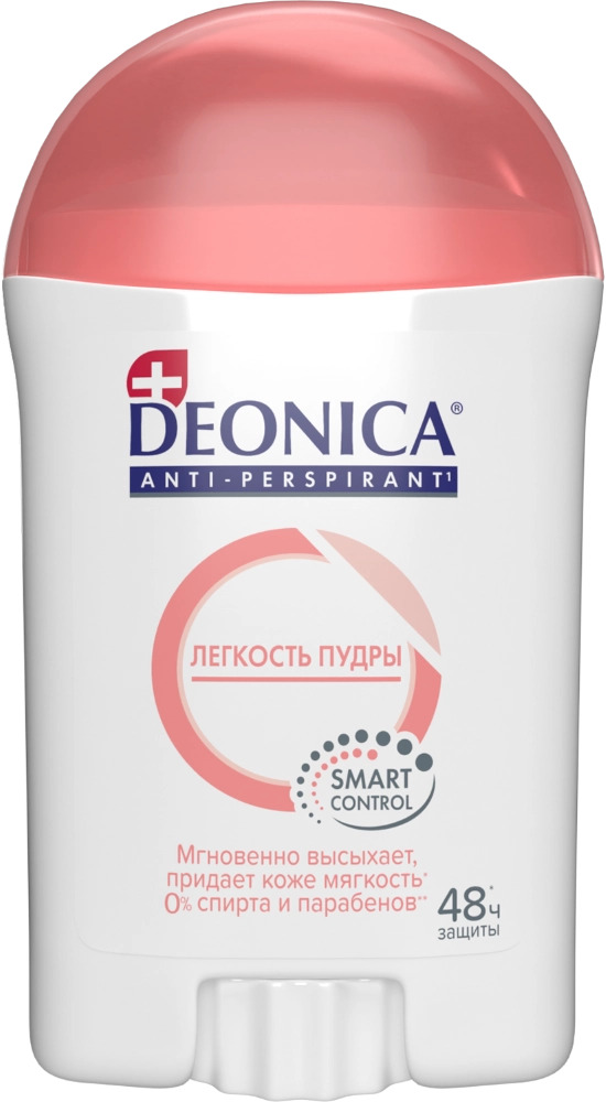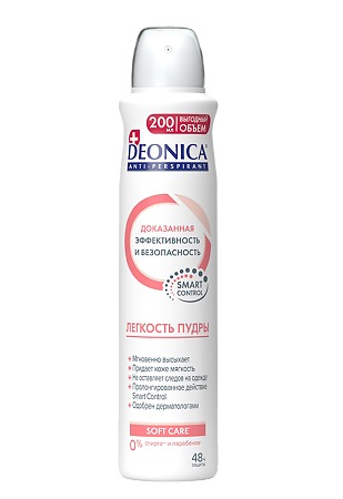 Антиперспирант женский Deonica Легкость пудры мгновенно высыхает и оставляет на коже приятное ощущение сухости и чистоты. Нежная текстура антиперспиранта Деоника Легкость пудры ухаживает за кожей подм... Показать описаниеышек, надежно защищает от пота и запаха, в том числе и благодаря технологии Smart Control. Смарт контрол активируется при повышении температуры тела и при увеличении двигательной активности. Дезодорант женский спрей сохраняет ощущение свежести до 48 часов. Антиперспирант для женщин Легкость пудры не оставляет следов на одежде, с ним любимые вещи будут дольше носиться. Дезодорант без алюминия не раздражает кожу, в нем нет солей, парабенов, спирта. Дезодорант женский Deonica одобрен дерматологами и протестирован. Он защищает от пота и запаха и окутывает нежным, ненавязчивым пудровым ароматом, который остается с вами практически весь день.
