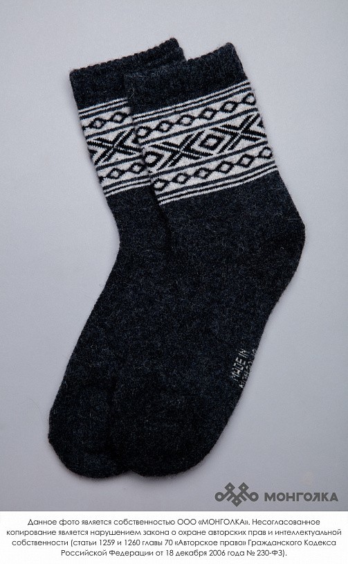 Носки из 100% натуральной шерсти монгольской овцы подарят ногам тепло и уют. Теплые носки плотно облегают стопу, хорошо фиксируются и не спадают при носке. На подошве используется технология двойной в... Показать описаниеязки, благодаря которой носки прослужат и согреют вас долгое время. В составе носков 100% натуральной овечьей шерсти, которая обладает обезболивающими, антибактериальными, противовоспалительными свойствами, из-за чего носки помогут при болях в суставах и усилят микроциркуляцию крови. Благодаря свойствам натуральной шерсти носки отводят лишнюю влагу и подарят чувство тепла и сухости в любую погоду. Шерстяные носки хорошо сочетаются с любым образом, поэтому в них будет приятно ходить как дома, так и надевать с зимней обувью. Носки подойдут как мужчинам, так и женщинам и станут приятным подарком для близких. В нашем ассортименте вы найдете еще больше товаров из натуральной шерсти, доставленных напрямую из Монголии. * Производитель: Монголия, TOD * Состав: 100% шерсть монгольской овцы * Цвет: серый с рисунком * Размер: 34-45 * Полноразмерные, соответствуют размеру обуви * Укрепленная стопа