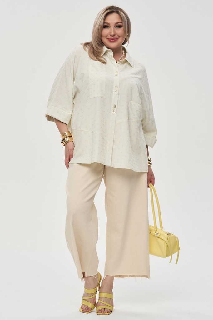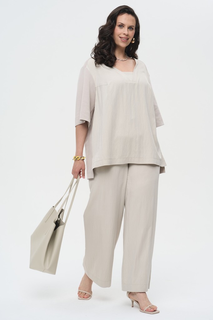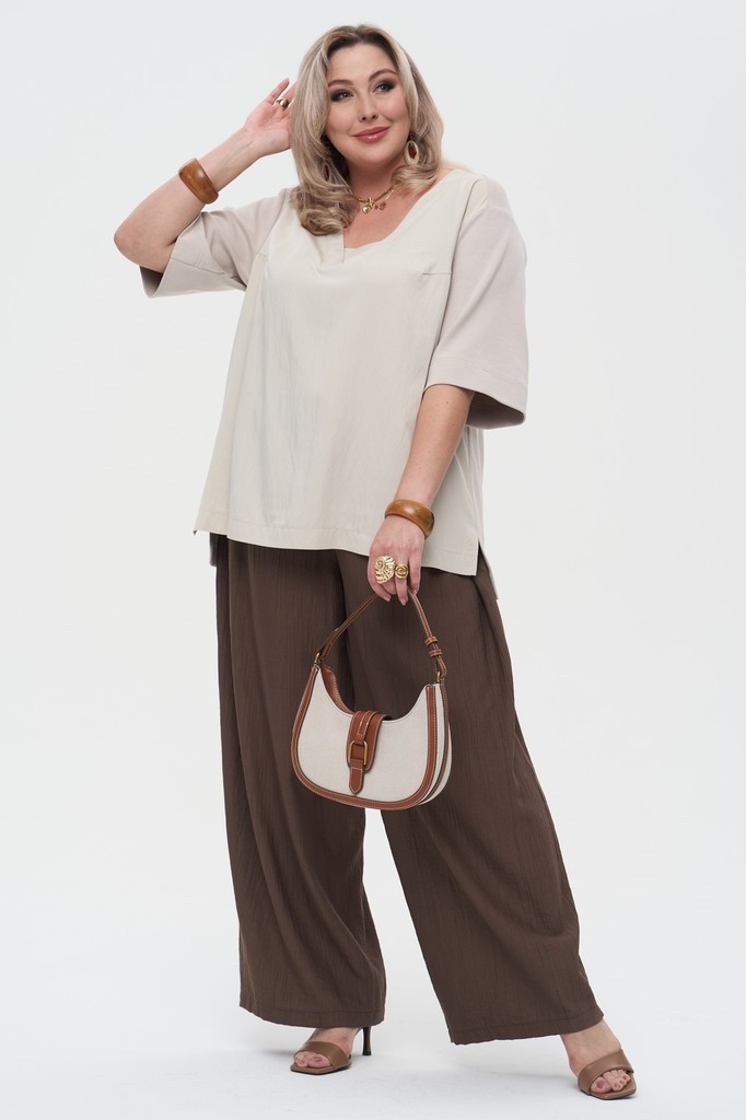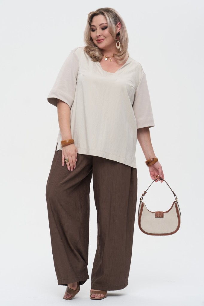 Состав: 85% Вискоза 15% Терилен. Элегантная блуза в лаконичном бежевом оттенке — идеальная база для создания расслабленных и стильных летних образов. Модель выполнена из мягкого смесового полотна с бл... Показать описаниеагородной фактурой, в составе которого вискоза и терилен. Такой подбор материалов обеспечивает изделию отличную воздухопроницаемость, мягкость и практичность в ежедневной носке. Конструктивные особенности: •Силуэт: Свободный крой оверсайз с прямым низом, который мягко драпирует фигуру и дарит абсолютный комфорт. •Вырез: Аккуратный V-образный вырез горловины визуально удлиняет шею и придает образу легкость. •Рукав: Цельнокроеный рукав длиной до локтя со спущенной линией плеча подчеркивает непринужденный стиль модели. •Детали: Деликатные вертикальные швы на полочке добавляют изделию графичности и визуально стройнят силуэт. •Длина: Стандартная длина с небольшими боковыми разрезами позволяет носить блузу как навыпуск, так и частично заправленной. Блуза «Виго» — универсальный элемент, который легко вписывается в многослойные комплекты. Она гармонично сочетается с широкими брюками из аналогичной ткани, создавая эффектный монохромный образ, или с контрастными коричневыми брюками, как представлено на фото. Благодаря нейтральному цвету и лаконичному дизайну, блуза станет безупречным выбором как для офисных будней, так и для прогулок на отдыхе. Подробное описание: https://www.intikoma.ru/catalog/vesna-leto-2026/85481/