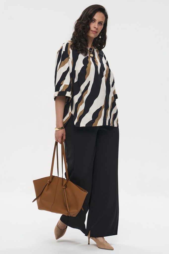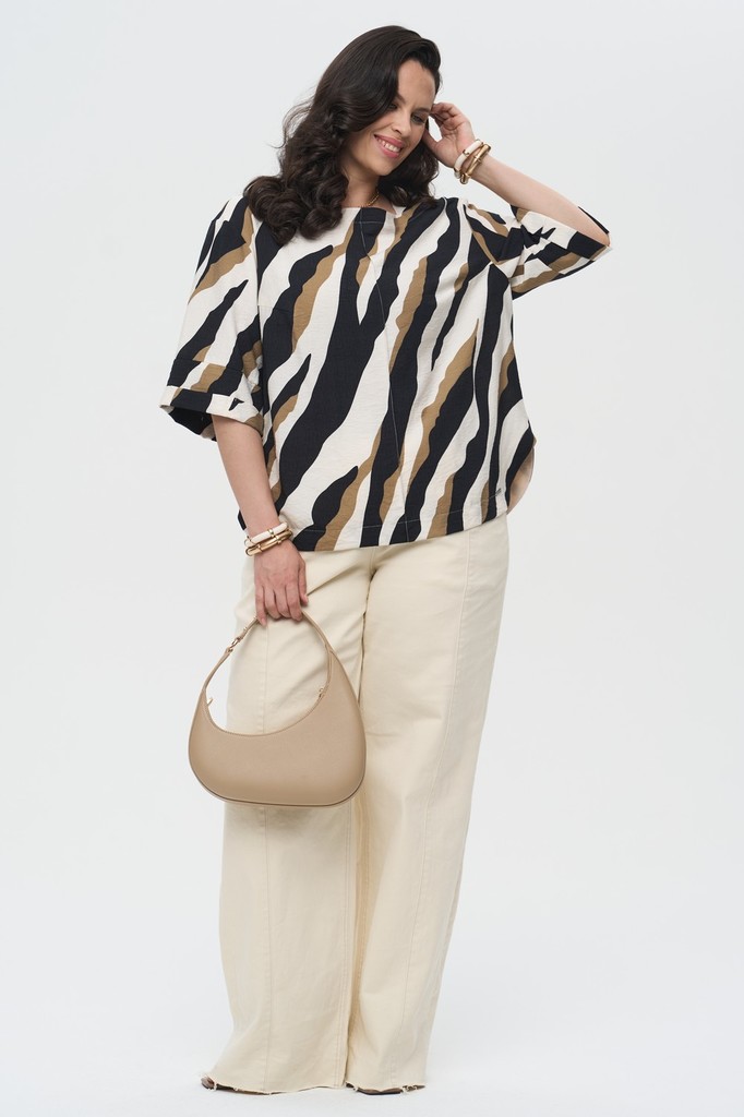 Состав: 80% Вискоза 20% Нейлон. Эффектная блуза с выразительным анималистичным принтом — идеальный выбор для создания смелого и стильного летнего образа. Модель выполнена из качественного смесового по... Показать описаниелотна, в составе которого 80% вискозы и 20% нейлона, что обеспечивает ткани мягкость, отличную воздухопроницаемость и практичность в уходе. Контрастный графичный рисунок в виде стилизованных полос придает изделию современную динамику и позволяет легко комбинировать его с базовыми элементами гардероба. Конструктивные особенности: •Силуэт: Свободный прямой крой, который мягко драпируется, обеспечивая комфортную посадку и свободу движений. •Горловина: Лаконичный вырез «лодочка», подчеркивающий линию плеч и придающий образу элегантность. •Рукав: Цельнокроеный рукав длиной до локтя со свободной проймой, что делает модель идеальной для жаркой погоды. •Детали: Продуманный крой без лишних застежек позволяет легко надевать блузу, создавая расслабленный повседневный силуэт. •Линия низа: Ровный срез с аккуратной обработкой, позволяющий носить блузу как навыпуск, так и частично заправленной. Блуза «Рьяна» превосходно гармонирует с черными широкими брюками «Бенефис», создавая эффектный и стройный ансамбль. Также она отлично смотрится со светлыми брюками или юбками, позволяя играть на контрасте фактур и цветов. Подробное описание: https://www.intikoma.ru/catalog/vesna-leto-2026/85511/