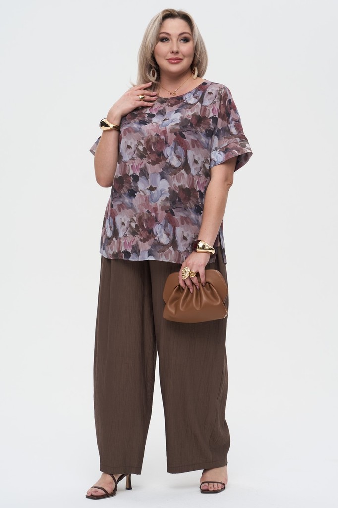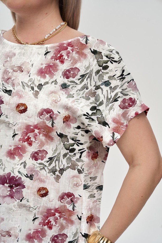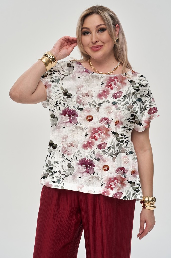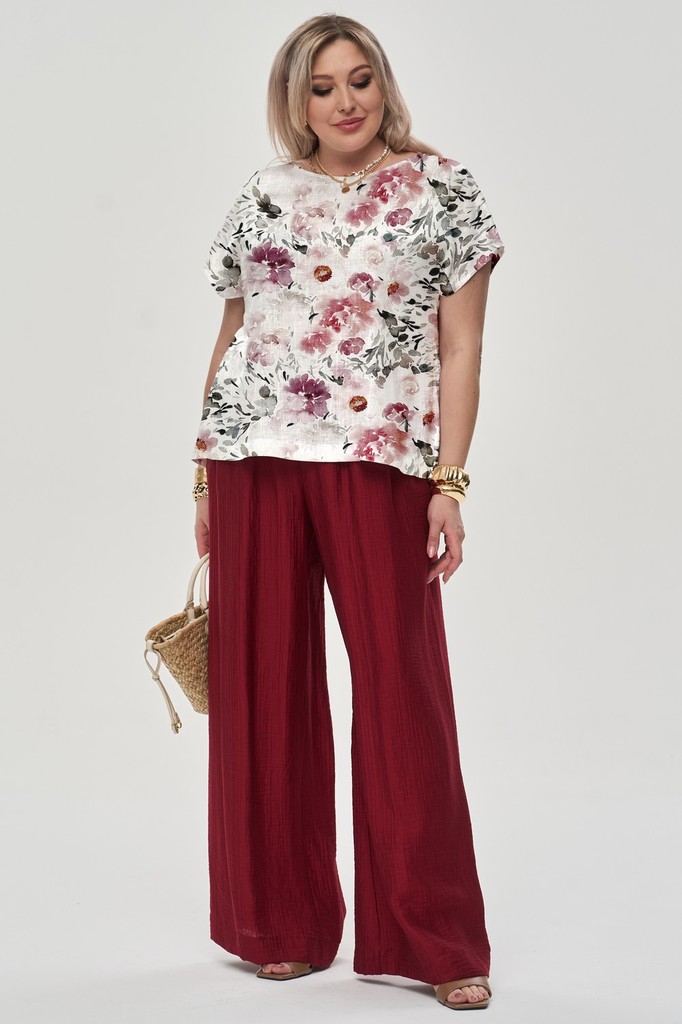 Состав: 55% Хлопок 45% Лен. Элегантная блуза свободного силуэта с живописным цветочным принтом — идеальный выбор для создания свежего и женственного летнего образа. Модель выполнена из натурального см... Показать описаниеесового полотна на основе хлопка и льна, что обеспечивает исключительный комфорт и приятные тактильные ощущения в жаркую погоду. Изысканный рисунок в розово-бордовой гамме на светлом фоне придает изделию романтичный характер и позволяет легко комбинировать его с различными элементами гардероба. Конструктивные особенности: •Силуэт: Свободный прямой крой, обеспечивающий непринужденную посадку и легкость движений. •Горловина: Лаконичный круглый вырез с аккуратной обработкой, подчеркивающий минималистичный стиль модели. •Рукав: Цельнокроеный короткий рукав со свободной проймой, создающий мягкую линию плеча. •Линия низа: Ровная, с деликатной финишной отделкой, что позволяет носить блузу как навыпуск, так и частично заправленной. •Принт: Деликатный флористический паттерн с акварельным эффектом, равномерно распределенный по всему полотну. Блуза идеально гармонирует с широкими брюками в бордовом цвете, создавая яркий и сбалансированный летний ансамбль. Подробное описание: https://www.intikoma.ru/catalog/vesna-leto-2026/86759/