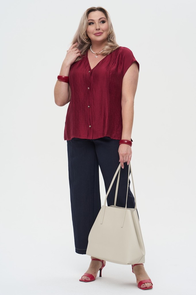 Состав: 80% Вискоза 20% Нейлон. Лаконичная блуза прямого силуэта в глубоком бордовом оттенке станет стильным и практичным дополнением вашего летнего гардероба. Модель выполнена из мягкого смесового по... Показать описаниелотна с благородной жатой фактурой («крэш-эффект»), которая придает изделию современный вид и делает его невероятно удобным в уходе. Благодаря дышащей ткани и расслабленному крою, блуза идеально подходит для создания комфортных повседневных образов в жаркую погоду. Конструктивные особенности: •Силуэт: Прямой свободный крой, обеспечивающий непринужденную посадку по фигуре и отличную циркуляцию воздуха. •Горловина: Элегантный V-образный вырез, плавно переходящий в аккуратную планку. •Застежка: Центральная застежка на аккуратные пуговицы в тон изделия, расположенные по всей длине передней полочки. •Рукав: Короткий цельнокроеный рукав со свободной проймой, подчеркивающий легкость и летний характер модели. •Линия талии: Свободная посадка, позволяющая носить блузу как навыпуск, так и в заправленном виде. •Линия низа: Ровная, с качественной финишной обработкой. Блуза идеально гармонирует с широкими брюками «Рибейро» в тон, создавая эффектный монохромный образ, или с контрастными темно-синими брюками для более сдержанного ансамбля. Подробное описание: https://www.intikoma.ru/catalog/vesna-leto-2026/85487/