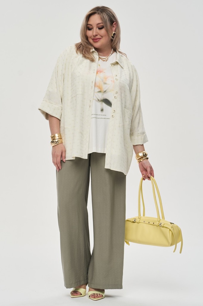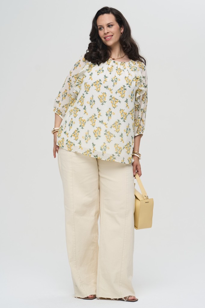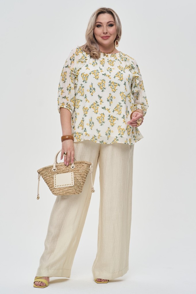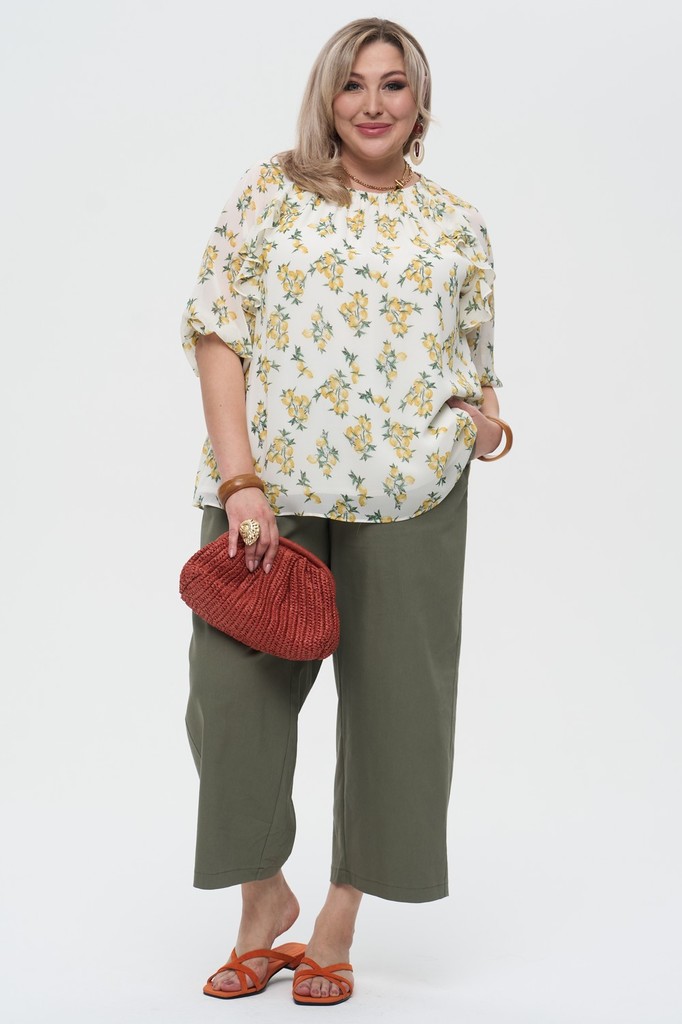 Состав: 70% Вискоза 30% Полиэстер. Элегантная блуза свободного силуэта с нежным цветочным принтом — воплощение легкости и весеннего настроения. Модель выполнена из тонкого струящегося полотна, которое... Показать описание мягко драпируется, создавая женственный и воздушный образ. Благодаря гармоничному сочетанию желтых и зеленых оттенков на светлом фоне, блуза легко комбинируется с различными элементами летнего гардероба, добавляя ансамблю свежести и романтичности. Конструктивные особенности: •Силуэт: Свободный прямой крой, обеспечивающий комфортную посадку и свободу движений. •Горловина: Широкий вырез округлой формы, дополненный аккуратной сборкой, которая создает мягкие вертикальные складки по полочке. •Рукав: Втачной рукав длиной 3/4 с объемными воланами по окату и эластичной манжетой по низу, позволяющей регулировать длину и пышность рукава. •Линия низа: Ровная, с качественной финишной отделкой, что позволяет носить блузу как навыпуск, так и частично заправленной. •Декор: Деликатные рюши вдоль проймы подчеркивают романтический стиль изделия и добавляют образу фактурности. Блуза идеально дополняет широкие брюки в бежевых или молочных тонах, создавая завершенный и стильный летний комплект. Подробное описание: https://www.intikoma.ru/catalog/vesna-leto-2026/85513/