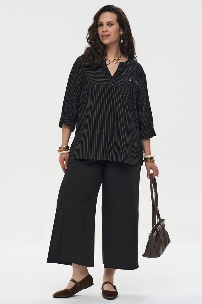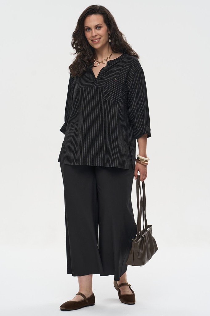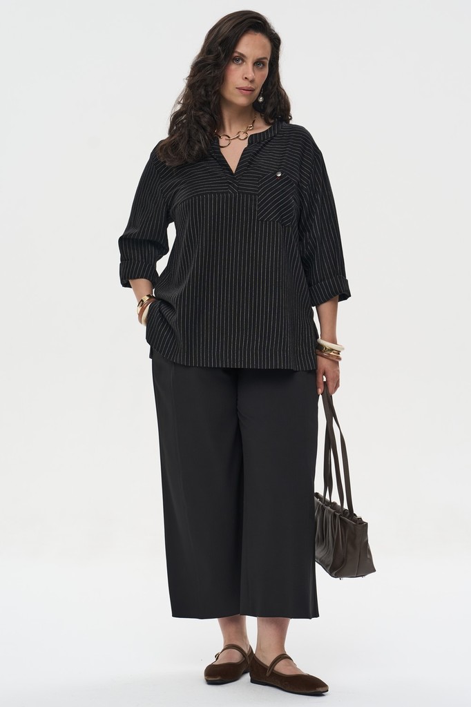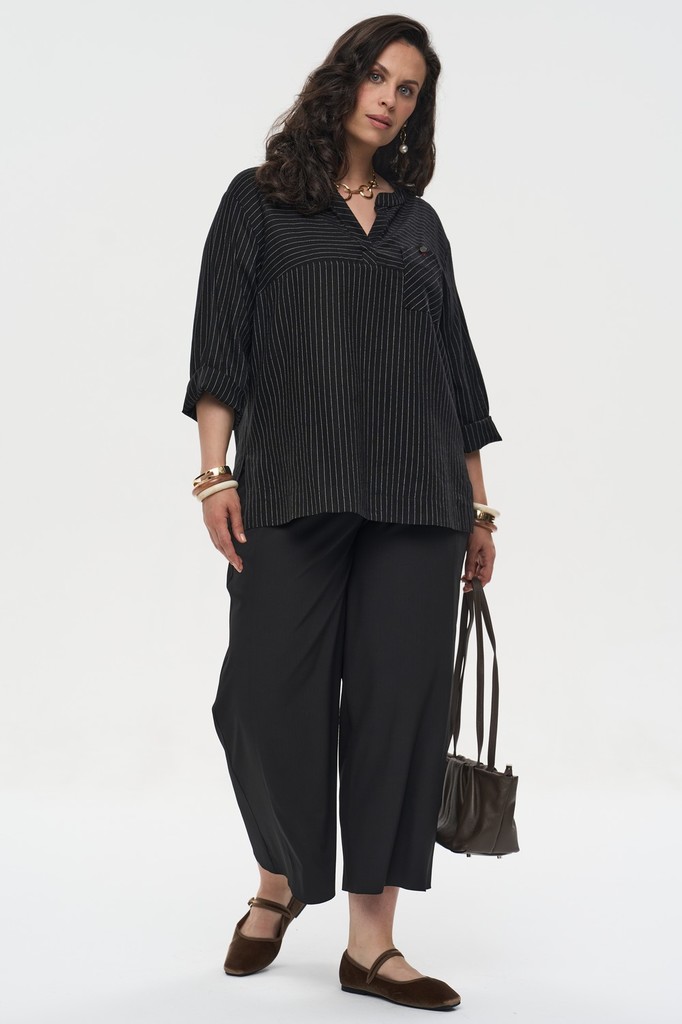 Состав: 65% Лен 35% Терилен. Лаконичная блуза в классическом стиле — универсальный элемент гардероба, сочетающий в себе элегантность и повседневный комфорт. Модель выполнена из качественного смесового... Показать описание полотна, в составе которого лен и терилен. Натуральный лен обеспечивает отличную терморегуляцию, а добавление терилена делает изделие практичным и устойчивым к сминанию. Конструктивные особенности: •Силуэт: Свободный прямой крой, который мягко обрисовывает фигуру и дарит ощущение легкости. •Вырез: Аккуратный V-образный вырез горловины, переходящий в небольшую планку, визуально удлиняет шею. •Рукав: Свободный рукав длиной три четверти со спущенной линией плеча подчеркивает расслабленный характер модели. •Детали: Накладной карман на груди добавляет образу функциональности и актуальный акцент в стиле кэжуал. •Принт: Тонкая светлая вертикальная полоска на черном фоне визуально стройнит и придает образу графичности. Блуза «Брунелло» — идеальная база для создания разнообразных ансамблей. Она великолепно сочетается с широкими черными брюками из аналогичной ткани, создавая стильный монохромный костюм, как представлено на фото. Также блуза будет гармонично смотреться с классическими юбками или денимом, становясь основой как для офисных будней, так и для вечерних прогулок. Подробное описание: https://www.intikoma.ru/catalog/vesna-leto-2026/86814/