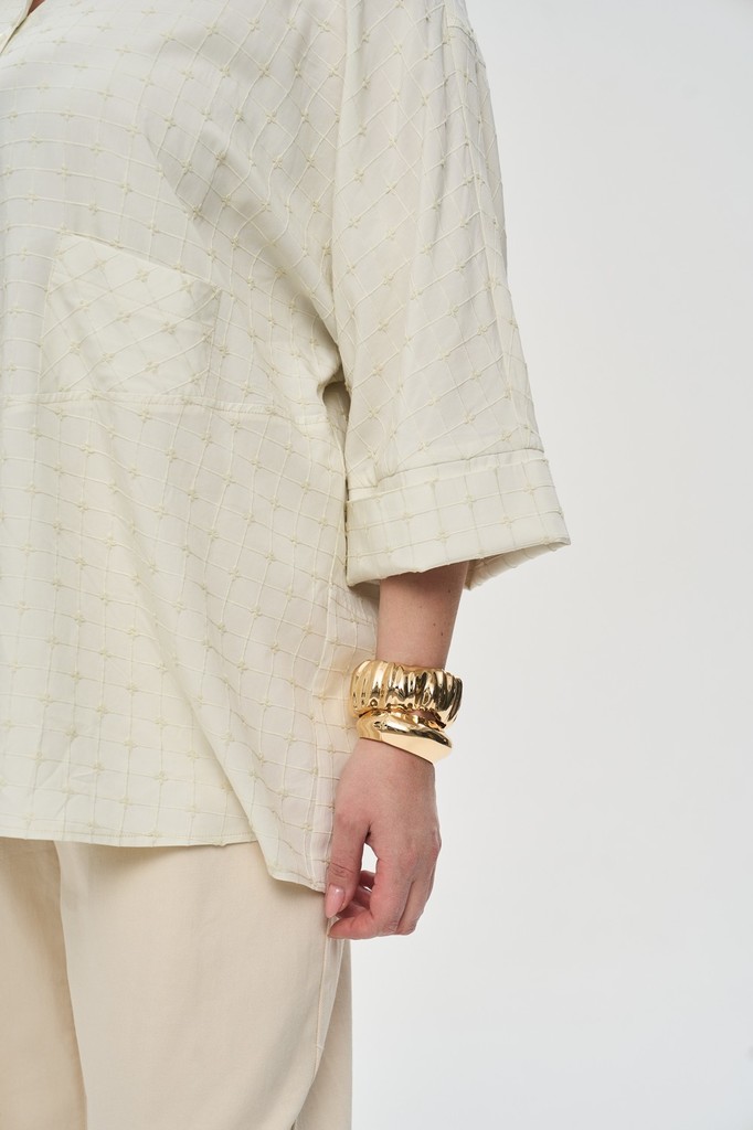 Состав: 60% Вискоза 40% Полиэстер. Нежная жаккардовая блуза из премиальной вискозы свободного кроя с V-образным вырезом и короткими рукавами составит безупречную базу для элегантного вечернего образа.... Показать описание Для удобства и легкого комбинирования низ изделия дополнили боковыми разрезами. Шелковистый и достаточно плотный материал красиво драпируется, нежно переливаясь на свету. Создавайте эффектные комплекты, комбинируя этот нарядную блузку с рубашками, жакетами и кардиганами из нашей коллекции. На модели 54-й размер. Параметры модели: Ог – 112см., От – 94 см., Об – 120 см. Рост 174 см. Подробное описание: https://www.intikoma.ru/catalog/osen-zima-2025-26/61230/