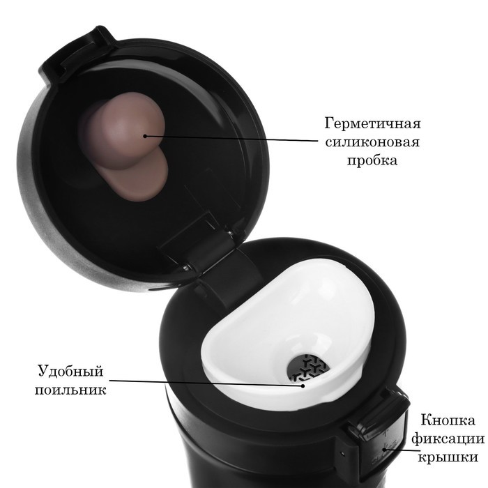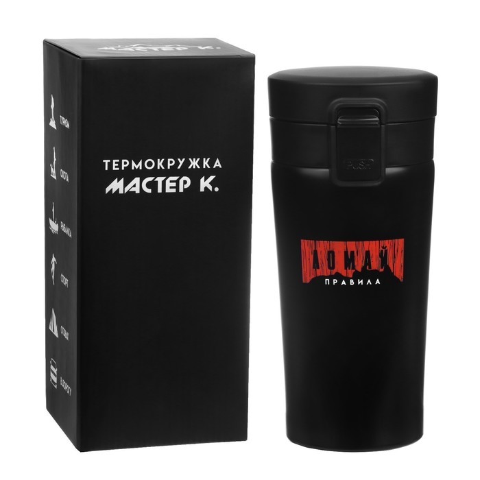 Термокружка для кофе и чая "Мастер К" идеальна для офиса, автомобиля, длительных прогулок и детям в школу. Благодаря специальному покрытию надежно лежит в руке. Термокружка "Мастер К" - это стильный а... Показать описаниексессуар и отличный подарок на новый год, другу, подруге, брату, сестре, девушке, папе, маме, мужу, жене, бабушке и дедушке на день рождения, 23 февраля, 8 марта, 14 февраля. Термокружка сделана из нержавеющей стали марки 304, сконструирована по вакуумной технологии, с двойной стенкой, следовательно, долго держит тепло и не проливается. Снабжена откидывающейся крышкой, изготовленной из экологичного пищевого пластика, имеется кнопка с функцией блокировки, позволяющая с легкостью использовать термос одной рукой. На дне, термокружка имеет специальную прорезиненную основу, предотвращающую царапины на поверхностях. Особенности: * можно открывать и закрывать одной рукой * удобное горлышко (поильник) * нескользящее дно * ставить в автомобильный подстаканник Характеристики: * Открывается с помощью нажатия, есть клапан с защитой от случайного открывания (поднять вверх - закрыть, опустить и нажать - открыть) * 100% защита от протекания * Стильный дизайн, приятна на ощупь * Сохраняет тепло до 8 часов и холод до 8 часов * Двойные стенки из нержавеющей стали * Сеточка из нержавеющей стали для фильтрации напитков * Перед первым применением обдайте внутреннюю колбу кипятком. * После того, как нальёте горячий напиток, через несколько секунд откройте кружку, выпустите пар и снова закройте. Так напиток дольше сохранит температуру. * Нельзя мыть в посудомоечной машине и нагревать в микроволновой печи.