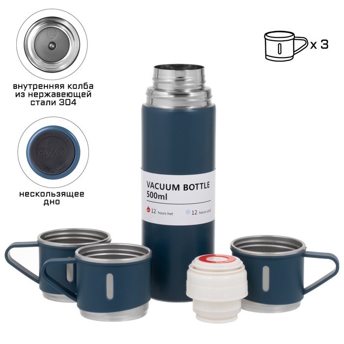 Набор «Мастер К», термос 500 мл и 3 кружки 160 мл, сохраняет тепло 12 ч, нержавеющая сталь, синийВопросы по товару
