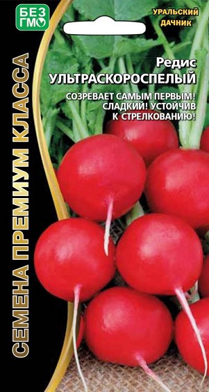 Новый ультраскороспелый, всесезонный гибрид (срок созревания 16-18 дней после посева), устойчивый к стрелкованию. Корнеплоды тёмно-красные, очень крупные, плотные, округлые, массой 25-35 г. Мякоть неж... Показать описаниеная, белая, сочная, без горечи, вкусовые качества отличные. Используется для приготовления салатов (не только корнеплоды, но и сами листья), содержит витамины, минеральные соли, которые ускоряют процесс пищеварения. Редис высевают в несколько сроков, с конца апреля (грядку укрывают пленкой до появления всходов), в дальнейшем, при необходимости, посевы проводят с интервалом 2-3 недели. Осенние посадки дают более крупные корнеплоды. Семена высевают в рядки с междурядьями 10-12 см, расстояние между семенами 2-3 см, глубина посева 1-1,5 см. В разгар лета, при самом длинном световом дне, посадки необходимо притенять. Полив регулярный, через 2-3 дня, в сухую погоду — ежедневно. Необходимо своевременно производить уборку.