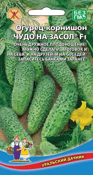 Очень скороспелый, партенокарпический (самоопыляемый), пучковый корнишонный гибрид. Выделяется обилием зеленцов на плетях, массированной отдачей урожая. Ветвление среднее или выше среднего. В узлах фо... Показать описаниермируется 3-6 завязей. Зеленцы бугорчатые, белошипые, ярко-зелёные, длиной 8-10 см, с частым опушением; шипы «не колючие»! Мякоть у огурцов плотная, что при консервировании позволяет получать хрустящие огурчики. Тёмно-зелёные крупнобугорчатые корнишончики не только собирать приятно, но и в банке, и на столе они будут украшением. В отличие от других сортов, плоды не горчат, даже при неблагоприятных погодных условиях. Поэтому из него Вы всегда можете приготовить вкусный салат, который придётся по вкусу и родным, и гостям. Урожай 27-30 кг/м2.