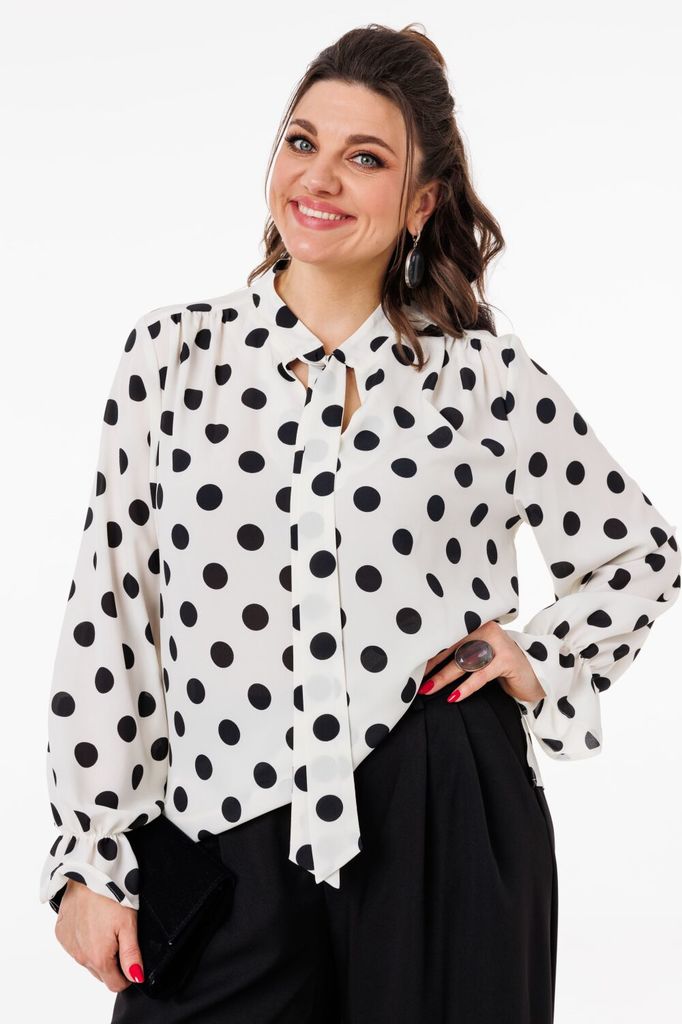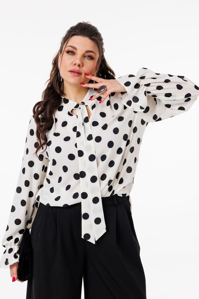 Состав: Вискоза-29%; ПЭ-71%; Блуза прямого силуэта, с округлой горловиной и слезкой по спинке. Длинный рукав  с воланом по низу, придаст вашему образу женственности, а сетка в мелкий горошек будет акт... Показать описаниеуальна вне зависимости от сезона. Для обладательниц красивой пышной груди рекомендуем выбирать на размер больше, чтобы силуэт вашей фигуры был изящнее и гораздо аппетитнее выглядел. На фото с жакетом артикул 1186 и брюками 1156 Anelli-Laurel. Замеры: Рост фотомодели – 170 см. Размер фотомодели – 54 ОГ- обхват груди; ОТ-обхват талии; ОБ-обхват бедер; ДИ-длина изделия; ДР- Длина рукава. Размер 46 ОГ-94; ОТ-94; ОБ- 106; ДИ- 67; ДР- 68. Размер 48 ОГ-98; ОТ-98; ОБ-110 ; ДИ-67; ДР- 68. Размер 50 ОГ-102; ОТ-102; ОБ- 114; ДИ- 67; ДР-68 . Размер 52 ОГ-106; ОТ-106; ОБ- 118; ДИ- 67; ДР-68 . Размер 54 ОГ-110; ОТ-110; ОБ- 122; ДИ- 67; ДР- 68. Размер 56 ОГ-114; ОТ-114; ОБ- 126; ДИ- 67; ДР- 68.