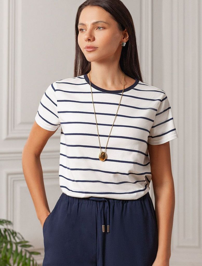 Базовая футболка в полоску полуприлегающая из премиального хлопка с эластаномВопросы по товару