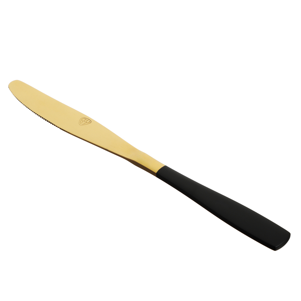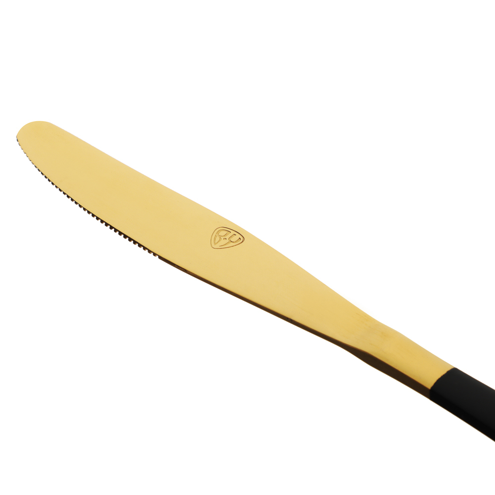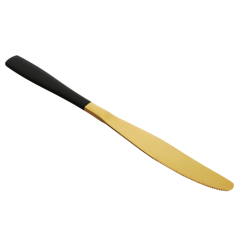 Столовый нож SATOSHI Talinka – это элегантный прибор для торжественной сервировки. Сочетание черной матовой рукояти и золотого лезвия смотрится роскошно и изысканно, превращая нож в яркий акцентный эл... Показать описаниеемент сервировки. Изделие из нержавеющей стали имеет высокую прочность, устойчивость к деформации и к коррозии. Эргономичная ручка обеспечивает удобный хват, а зубчатое лезвие гарантирует легкое и аккуратное разрезание блюд и не требует заточки. Идеальный выбор для тех, кто ценит премиальный дизайн и безупречное качество. Для создания гармоничного единого стиля сервировки комплект можно дополнить другими столовыми приборами из одноименной коллекции.