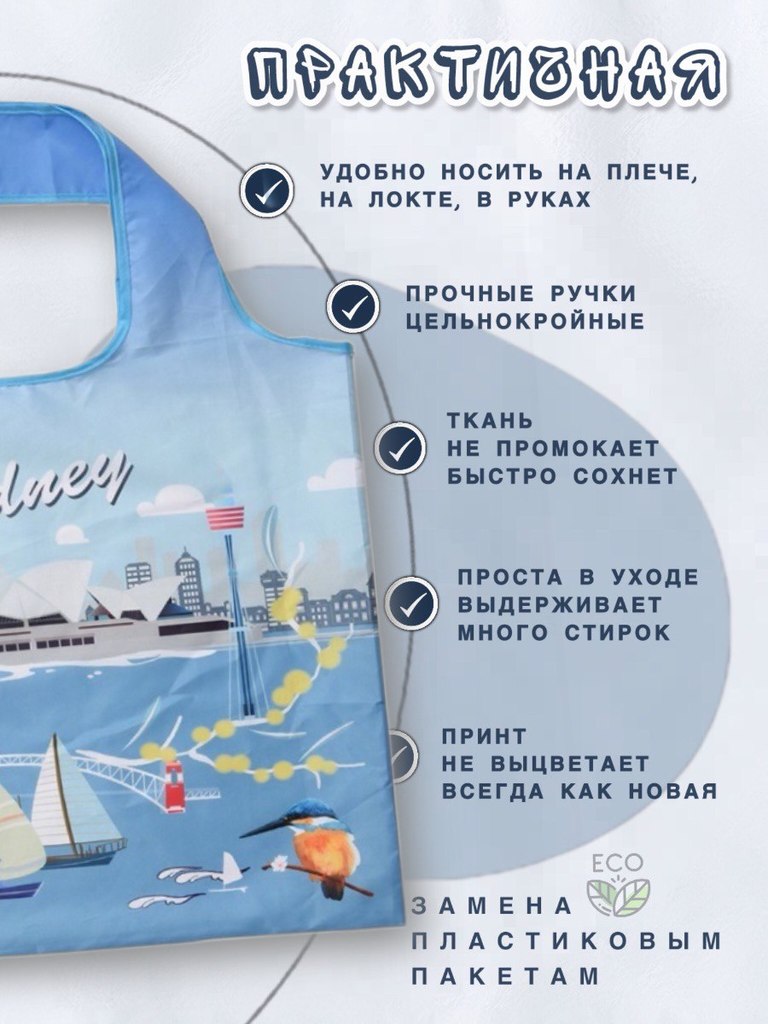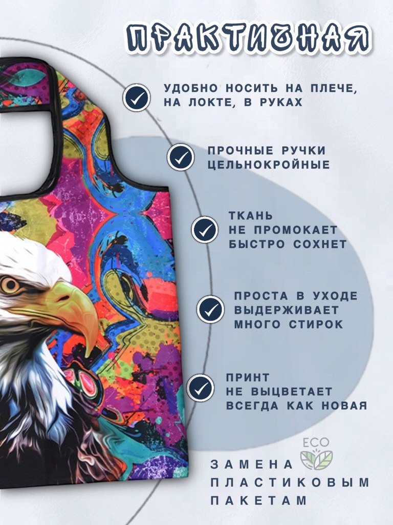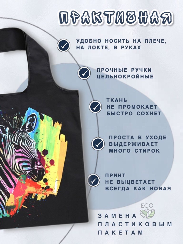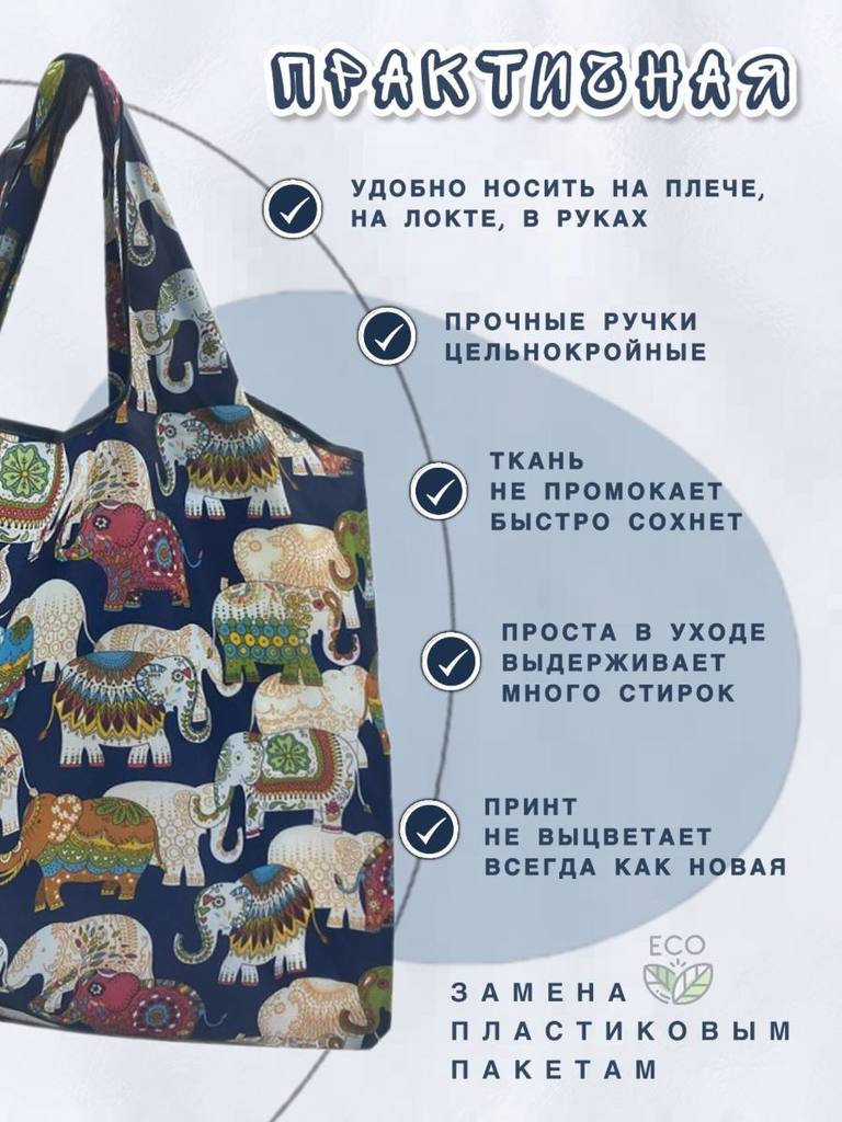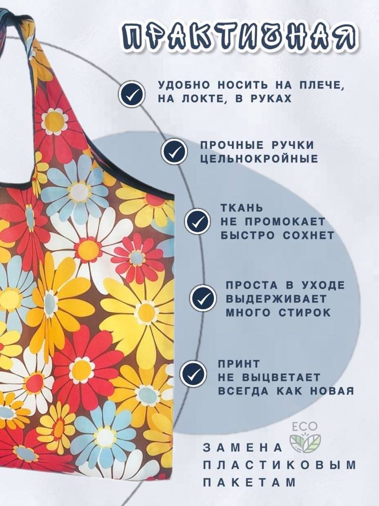 Материал: 100% полиэстер (оксфорд 210D) Объем: от 20 литров Вес изделия: 0,04 Размер сумки: 50х40см Высота ручек: 26см Размер сложенной сумки: 12,5х14см Производитель- Yiwu Lunzhu Luggage Co.,Ltd/Адре... Показать описаниес: Yiwu Lunzhu Luggage Co.,Ltd/Адрес- 103,ул.Бэйюань, город Иу, городской округ Цзиньхуа, провинция Чжэцзян Создано для вас и планеты Заменяя ненужные одноразовые пакеты на долговечные сумки многоразового использования, мы защищаем нашу планету от загрязнения и сохраняем ее красоту для будущих поколений. Выберите свою любимую сумку, и берите ее с собой куда угодно, каждый день, год за годом, помогая спасти нашу планету и океаны от пластикового мусора! Используйте ее как любимую сумку для прогулок: в парке, на пляже, в бассейне, в путешествиях. Идеально для похода в театр или на любые другие мероприятия, где необходимо сдать уличную обувь в гардероб. * Большие по размеру, но красиво и аккуратно складываются в конверт. * Не занимают много места. Легко поместится в кармане дамской сумочки. * Легкая в уходе. Можно стирать в машинке на режиме "синтетика" * Яркая расцветка - принт не побледнеет после многочисленных стирок. * Долго прослужит. Прочная ткань оксфорд 210D