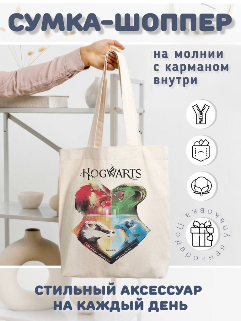 67219 Гарри Поттер "Хогвартс. Соревнования" | Сумка-шоппер на молнии, с внутренним карманом, р-р 38х34см/ высота ручек 27см (бежевый лен)Вопросы по товару