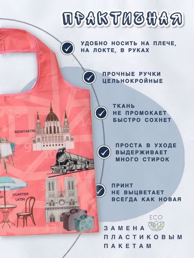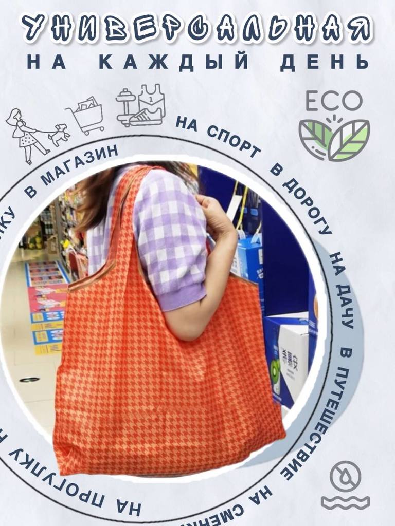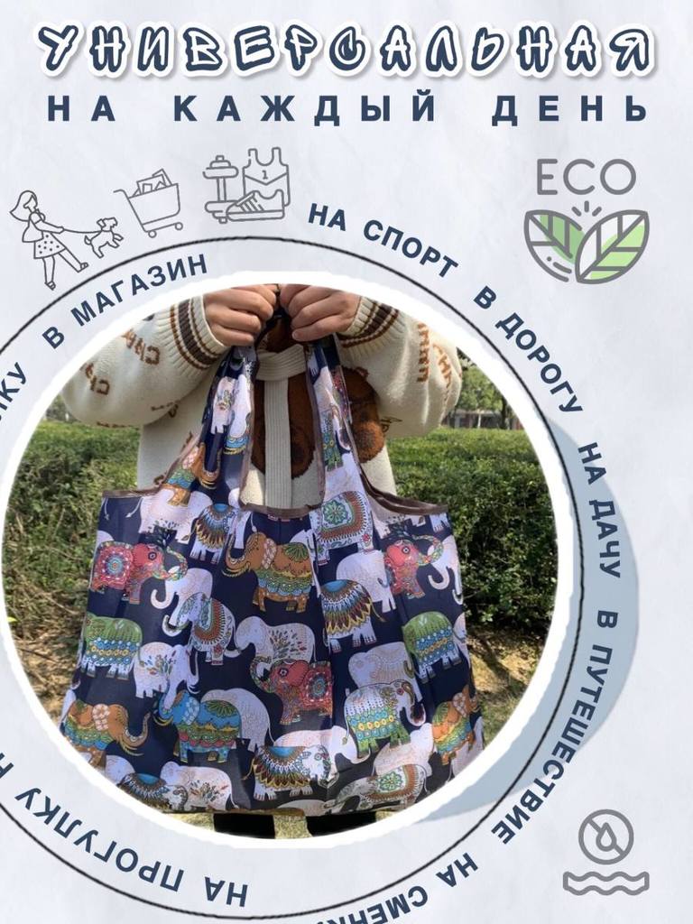 Объем: от 20 литров Вес изделия: 0,04 Материал: 100% полиэстер (оксфорд 210D) Размер: 52х40см Размер сложенной сумки: 12,5х14см Производитель- Yiwu Lunzhu Luggage Co.,Ltd/Адрес: Yiwu Lunzhu Luggage Co... Показать описание.,Ltd/Адрес- 103,ул.Бэйюань, город Иу, городской округ Цзиньхуа, провинция Чжэцзян Создано для вас и планеты Заменяя ненужные одноразовые пакеты на долговечные сумки многоразового использования, мы защищаем нашу планету от загрязнения и сохраняем ее красоту для будущих поколений. Выберите свою любимую сумку, и берите ее с собой куда угодно, каждый день, год за годом, помогая спасти нашу планету и океаны от пластикового мусора! Используйте ее как любимую сумку для прогулок: в парке, на пляже, в бассейне, в путешествиях. Идеально для похода в театр или на любые другие мероприятия, где необходимо сдать уличную обувь в гардероб. * Большие по размеру, но красиво и аккуратно складываются в конверт. * Не занимают много места. Легко поместится в кармане дамской сумочки. * Легкая в уходе. Можно стирать в машинке на режиме "синтетика" * Яркая расцветка - принт не побледнеет после многочисленных стирок. * Долго прослужит. Прочная ткань оксфорд 210D