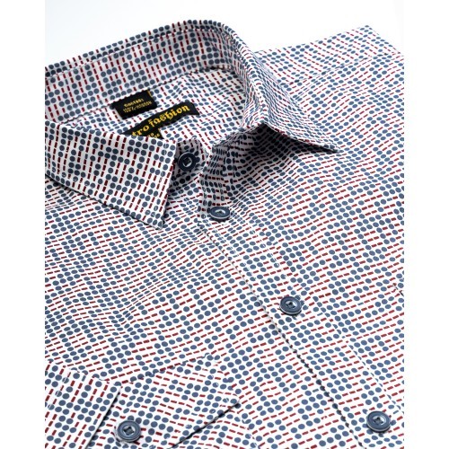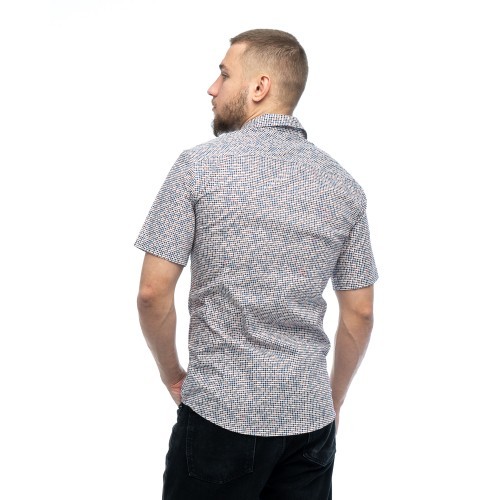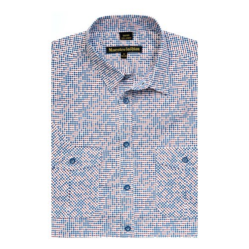 Хлопковая мужская рубашка с коротким рукавом. Силуэт приталенный с вытачками на спинке. Застежка на пуговицах. Воротник мягкий. На груди два на накладных кармана с клапанами. Состав: 100% хлопок. Дыша... Показать описаниещая ткань позволяет мужчине чувствовать себя комфортно в течение всего дня. Принт на ткани. Цвет: голубой, красный. Ищете качественную рубашку для вашего мужчины? Обратите внимание на нашу мужскую рубашку из хлопка от российского бренда Maestro Fashion. Рубашка идеально подойдет как для повседневного использования, так и для торжественных случаев, для мужчины, юноши, подростка. Кроме того, она прекрасно сочетается с брюками или джинсами, создавая стильный и модный образ. Можно носить как на выпуск, так и в заправленном виде. Молодежная рубашка доступна по демократичной цене, что делает ее доступной для каждого покупателя. Не упустите возможность приобрести эту качественную и стильную вещь для гардероба вашего мужчины. Наша компания предлагает быструю доставку по всей стране. Вы можете выбрать подходящий размер из нашего широкого ассортимента. Закажите мужскую приталенную модную сорочку прямо сейчас и наслаждайтесь ее качеством и стилем!