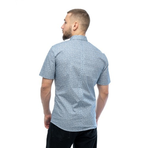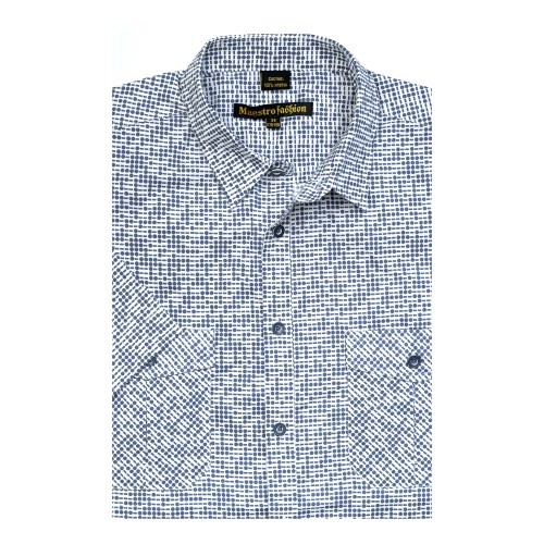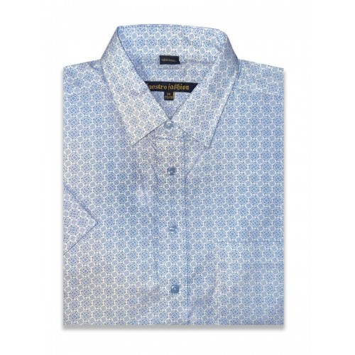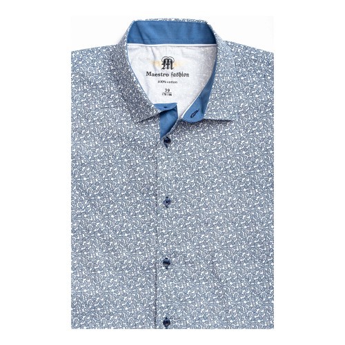 Хлопковая мужская рубашка с коротким рукавом. Силуэт приталенный с вытачками на спинке. Застежка на пуговицах. Воротник мягкий. На груди два на накладных кармана с клапанами. Состав: 100% хлопок. Дыша... Показать описаниещая ткань позволяет мужчине чувствовать себя комфортно в течение всего дня. Принт на ткани. Цвет: голубой, белый. Ищете качественную рубашку для вашего мужчины? Обратите внимание на нашу мужскую рубашку из хлопка от российского бренда Maestro Fashion. Рубашка идеально подойдет как для повседневного использования, так и для торжественных случаев, для мужчины, юноши, подростка. Кроме того, она прекрасно сочетается с брюками или джинсами, создавая стильный и модный образ. Можно носить как на выпуск, так и в заправленном виде. Молодежная рубашка доступна по демократичной цене, что делает ее доступной для каждого покупателя. Не упустите возможность приобрести эту качественную и стильную вещь для гардероба вашего мужчины. Наша компания предлагает быструю доставку по всей стране. Вы можете выбрать подходящий размер из нашего широкого ассортимента. Закажите мужскую приталенную модную сорочку прямо сейчас и наслаждайтесь ее качеством и стилем!