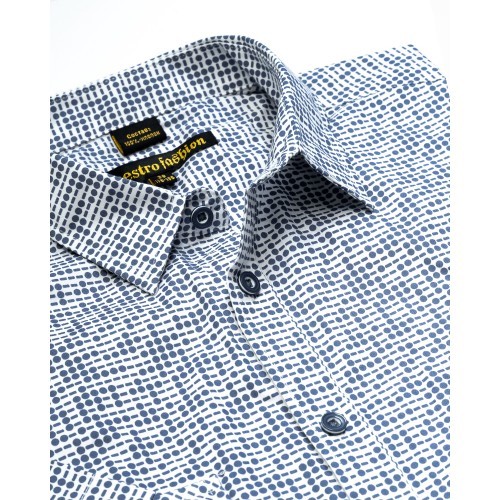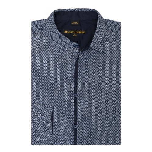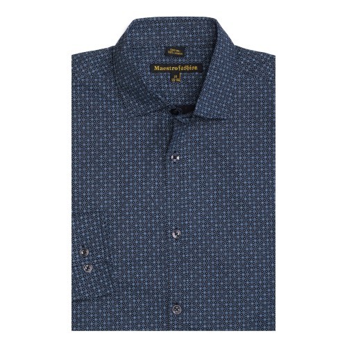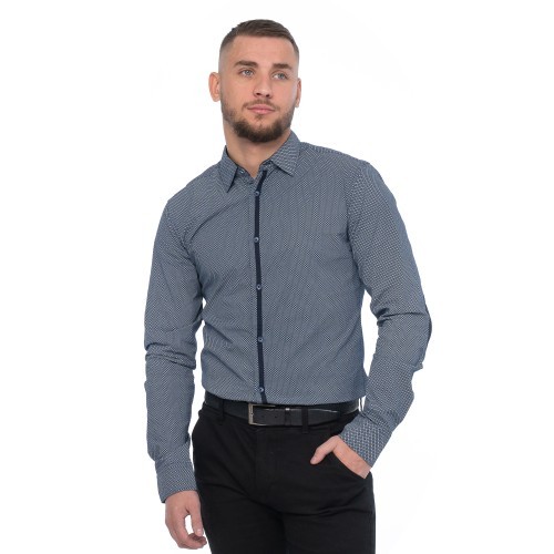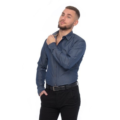Хлопковая мужская рубашка с длинным рукавом. Силуэт приталенный с вытачками на спинке. Застежка на пуговицах. Воротник мягкий. Состав: 100% хлопок. Дышащая ткань позволяет мужчине чувствовать себя ком... Показать описаниефортно в течение всего дня. Микропринт. Цвет: темно-синий, голубой. Ищете качественную рубашку для вашего мужчины? Обратите внимание на нашу мужскую рубашку из хлопка от российского бренда Maestro Fashion. Рубашка идеально подойдет как для повседневного использования, так и для торжественных случаев, для мужчины, юноши, подростка. Кроме того, она прекрасно сочетается с брюками или джинсами, создавая стильный и модный образ. Можно носить как на выпуск, так и в заправленном виде. Молодежная рубашка доступна по демократичной цене, что делает ее доступной для каждого покупателя. Не упустите возможность приобрести эту качественную и стильную вещь для гардероба вашего мужчины. Наша компания предлагает быструю доставку по всей стране. Вы можете выбрать подходящий размер из нашего широкого ассортимента. Закажите мужскую приталенную модную сорочку прямо сейчас и наслаждайтесь ее качеством и стилем!