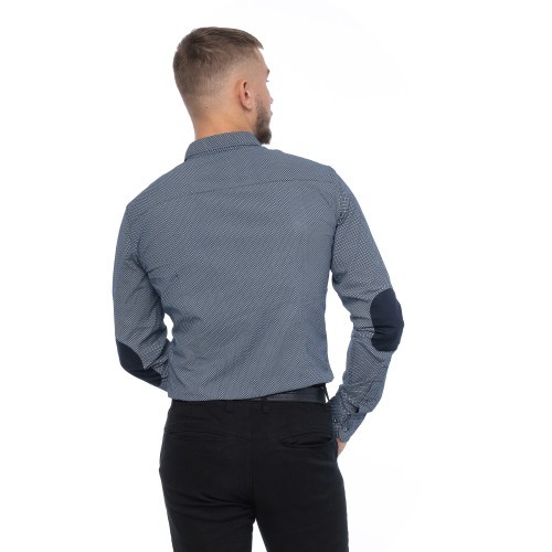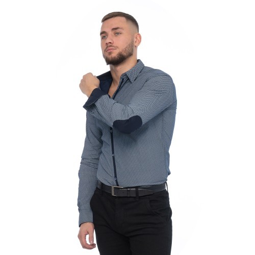 Хлопковая мужская рубашка с длинным рукавом. Силуэт приталенный с вытачками на спинке. Застежка на пуговицах. Воротник мягкий. Состав: 100% хлопок. Цвет темно-синий. Дышащий материал позволяет мужчине... Показать описание чувствовать себя комфортно в течение всего дня. Мелкий принтованный рисунок на ткани. Заплатки на локтях добавляют рубашке практичности. Ищете качественную рубашку для вашего мужчины? Обратите внимание на нашу мужскую рубашку из хлопка от российского бренда Maestro Fashion. Рубашка идеально подойдет как для повседневного использования, так и для торжественных случаев, для мужчины, юноши, подростка. Кроме того, она прекрасно сочетается с брюками или джинсами, создавая стильный и модный образ. Можно носить как на выпуск, так и в заправленном виде. Молодежная рубашка доступна по демократичной цене, что делает ее доступной для каждого покупателя. Не упустите возможность приобрести эту качественную и стильную вещь для гардероба вашего мужчины. Наша компания предлагает быструю доставку по всей стране. Вы можете выбрать подходящий размер из нашего широкого ассортимента. Закажите мужскую приталенную модную сорочку прямо сейчас и наслаждайтесь ее качеством и стилем!