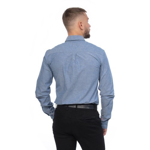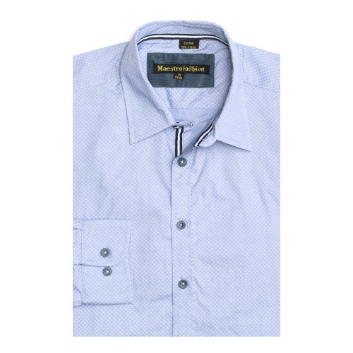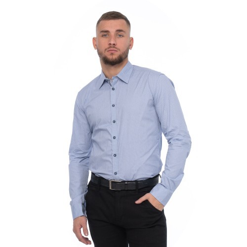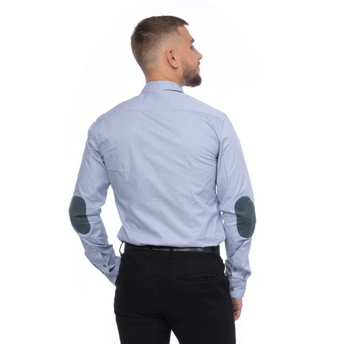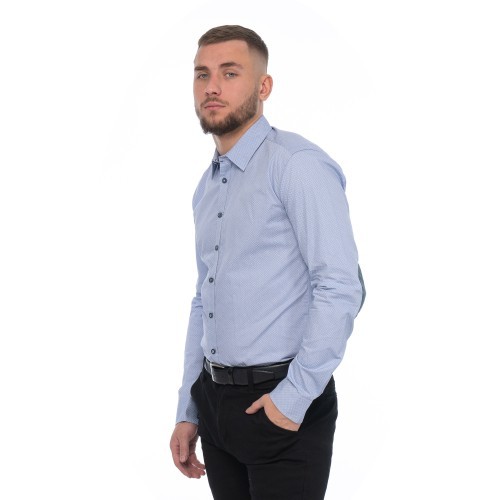 Хлопковая мужская рубашка с длинным рукавом. Силуэт приталенный с вытачками на спинке. Застежка на пуговицах. Воротник мягкий. Состав: 100% хлопок. Цвет голуой. Дышащий материал позволяет мужчине чувс... Показать описаниетвовать себя комфортно в течение всего дня. Мелкий принтованный рисунок на ткани. Заплатки на локтях добавляют рубашке практичности. Ищете качественную рубашку для вашего мужчины? Обратите внимание на нашу мужскую рубашку из хлопка от российского бренда Maestro Fashion. Рубашка идеально подойдет как для повседневного использования, так и для торжественных случаев, для мужчины, юноши, подростка. Кроме того, она прекрасно сочетается с брюками или джинсами, создавая стильный и модный образ. Можно носить как на выпуск, так и в заправленном виде. Молодежная рубашка доступна по демократичной цене, что делает ее доступной для каждого покупателя. Не упустите возможность приобрести эту качественную и стильную вещь для гардероба вашего мужчины. Наша компания предлагает быструю доставку по всей стране. Вы можете выбрать подходящий размер из нашего широкого ассортимента. Закажите мужскую приталенную модную сорочку прямо сейчас и наслаждайтесь ее качеством и стилем!